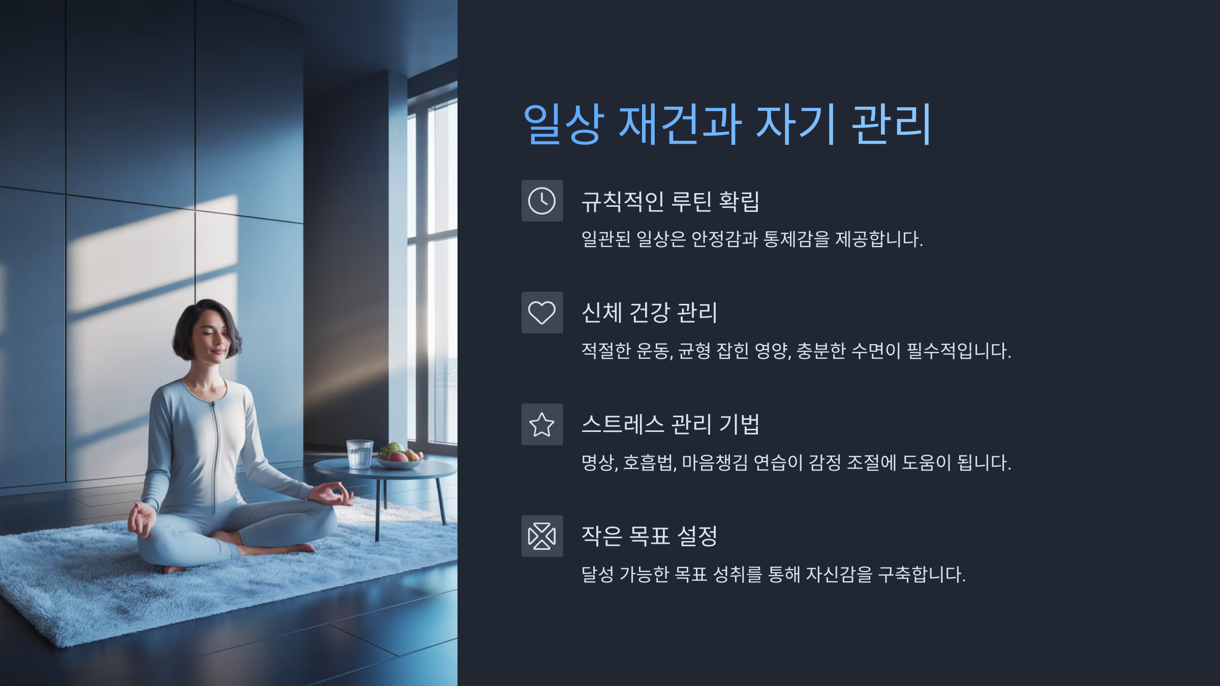 일정 시간에 맞춰 기상하고 세수하거나 양치하는 것 역시 회복의 한 걸음이에요. 스스로의 존재를 돌보는 행위는 자존감을 조금씩 회복시키는 데 도움을 줘요. 이 과정에서 중요한 건 ‘비교하지 않는 것’이에요. 누구와도 비교하지 말고 오직 어제의 나와 비교하며 나아가야 해요.
