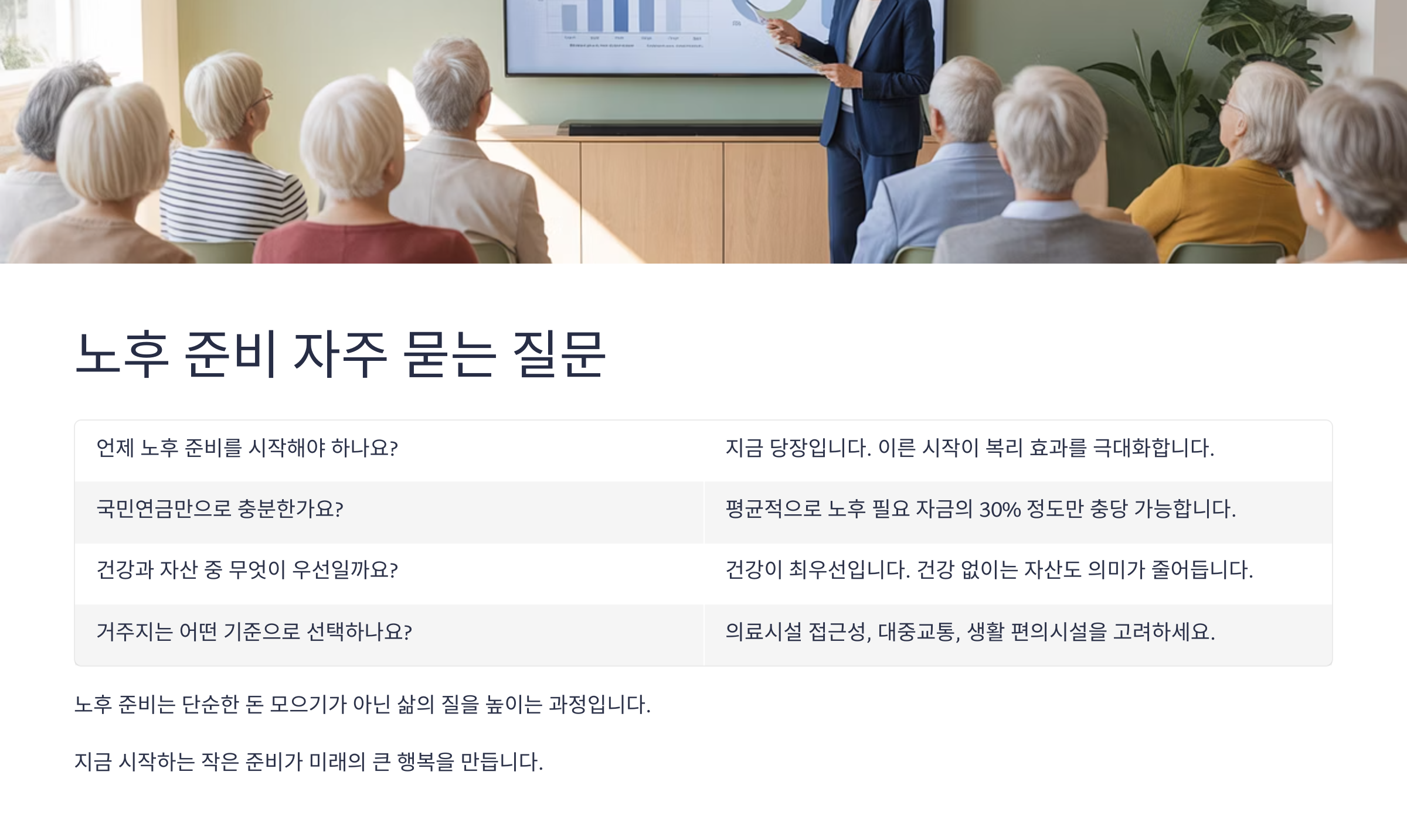 마지막으로 노후는 단순히 대비하는 것이 아니라 ‘설계’하는 거예요. 내가 어떤 삶을 살고 싶은지, 누구와 어디서 무엇을 하며 지낼지까지 구체적인 그림을 그려보세요. 그래야 그에 맞는 준비가 가능하고, 의미 있는 노후가 펼쳐질 수 있어요 😊