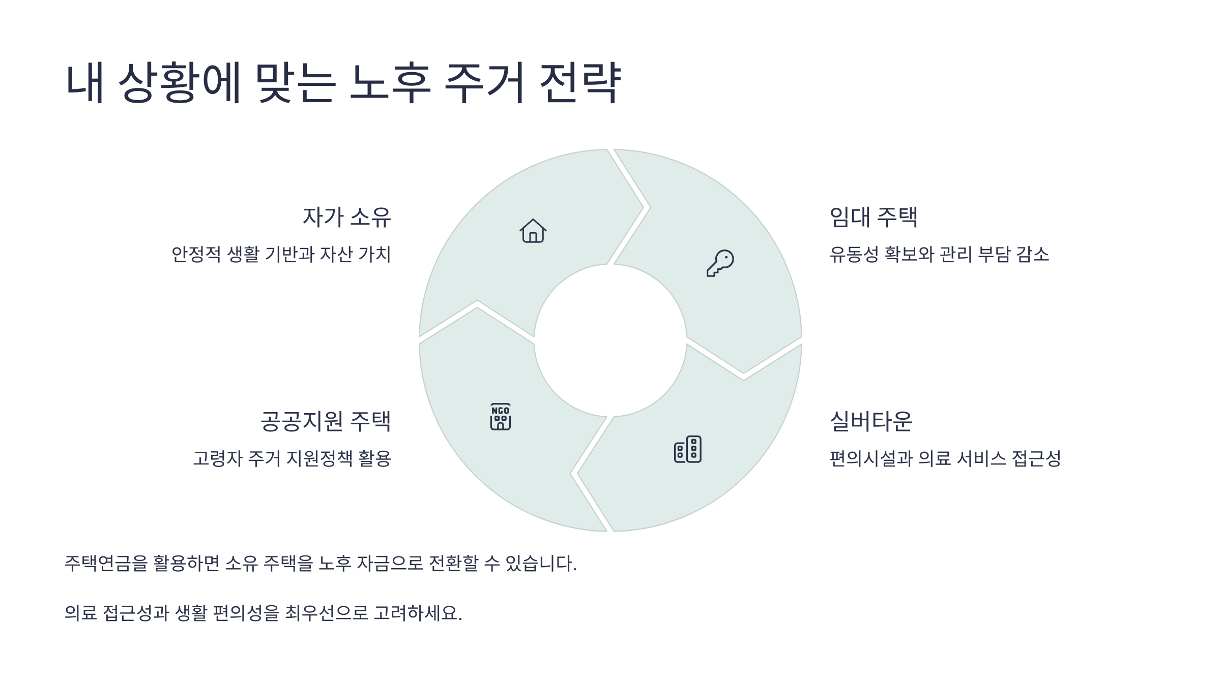 주거 형태 장점 단점 추천 대상 자가 거주 안정감, 관리 용이 유지 비용 부담 경제적 여유 있는 분 전세·월세 유동성 확보 임대료 상승 리스크 자산을 운용 중인 분 실버타운 복지 서비스 제공 입주 조건 제한 돌봄이 필요한 분 전원주택 자연 친화, 여유로움 의료 접근성 낮음 자급자족을 원할 때 노후 주거는 삶의 기반이자 행복의 토대예요. 삶의 변화에 따라 언제든지 유연하게 대응할 수 있는 유동성과, 편안함을 주는 안정성이 동시에 고려되어야 해요. 너무 늦기 전에 미리 계획을 세워두는 게 가장 좋은 선택이랍니다 😊