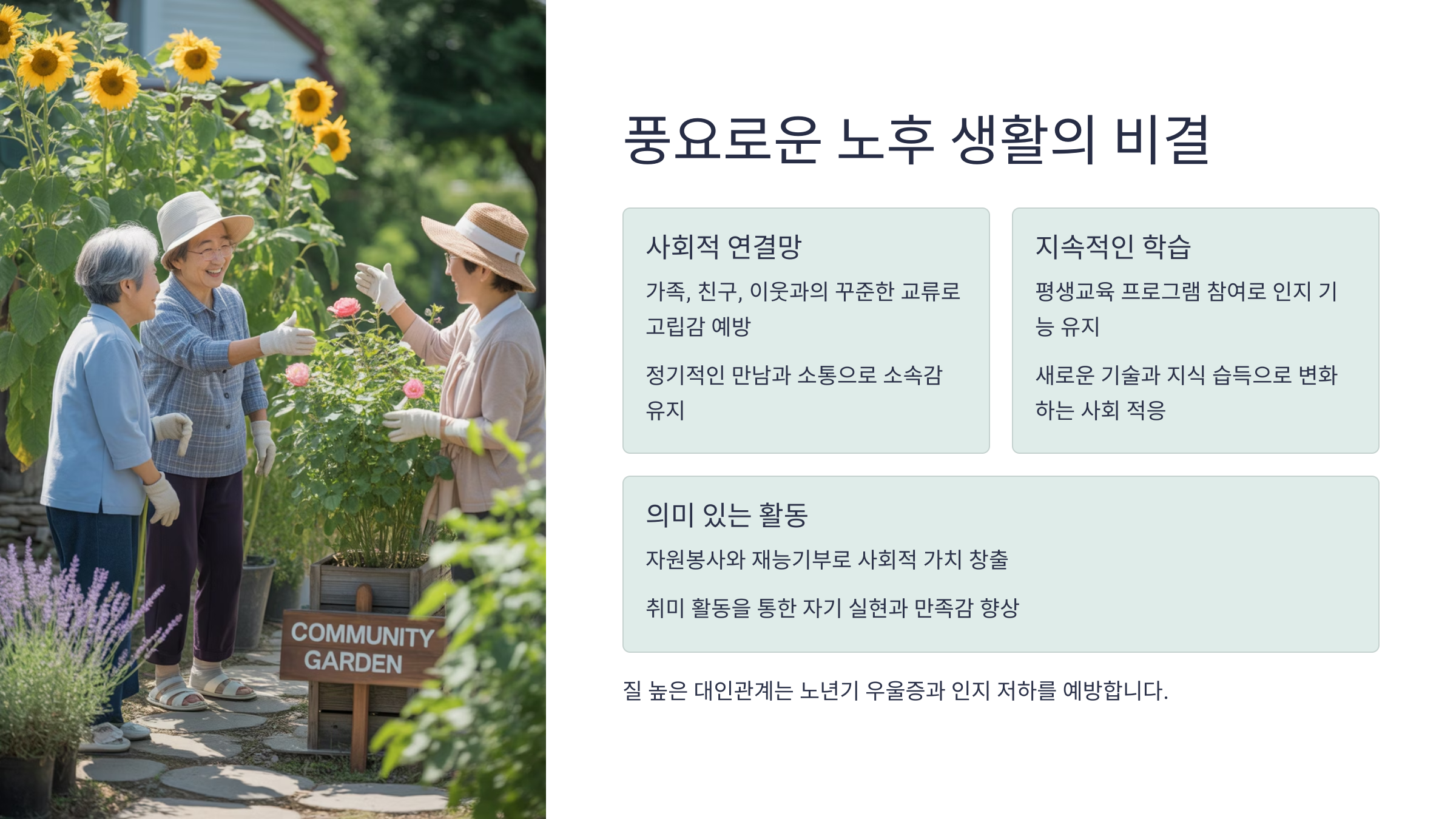 노후가 외롭고 지루하다고 느껴지는 가장 큰 이유 중 하나는 바로 인간관계 단절이에요. 직장 동료들과의 관계가 끊기고, 자녀들도 독립하게 되면 사회적 고립을 느끼기 쉬워요. 그래서 노후에는 적극적으로 새로운 인간관계를 형성하려는 노력이 정말 중요해요.