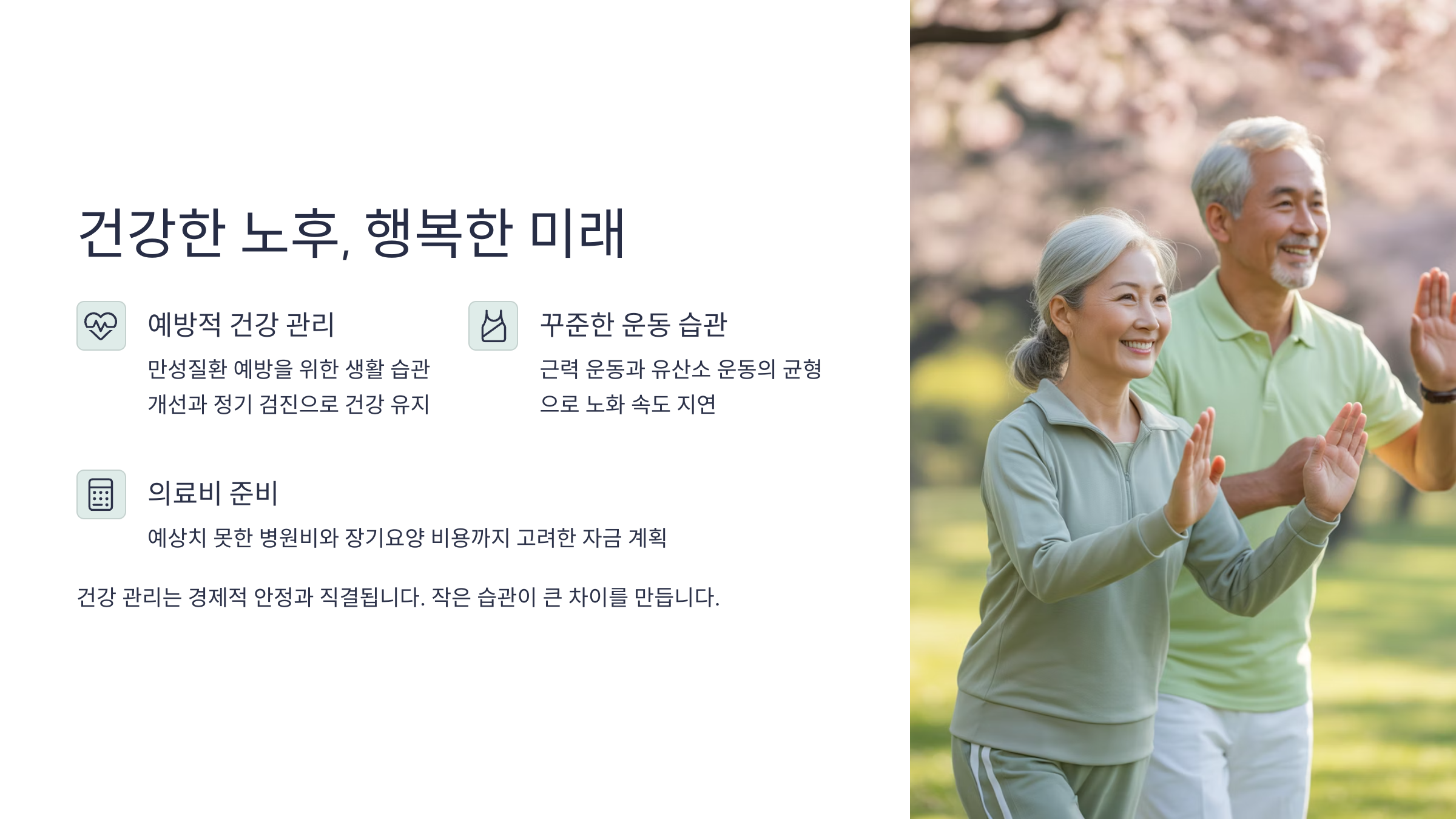 돈도 중요하지만, 건강이 뒷받침되지 않으면 아무 의미가 없죠. 노후를 건강하게 보내기 위해선 체계적인 관리가 정말 필수예요. 많은 사람이 건강에 대한 걱정을 은퇴 후에 시작하는데, 그땐 이미 늦은 경우가 많답니다. 평소의 습관과 예방이 핵심이에요!
