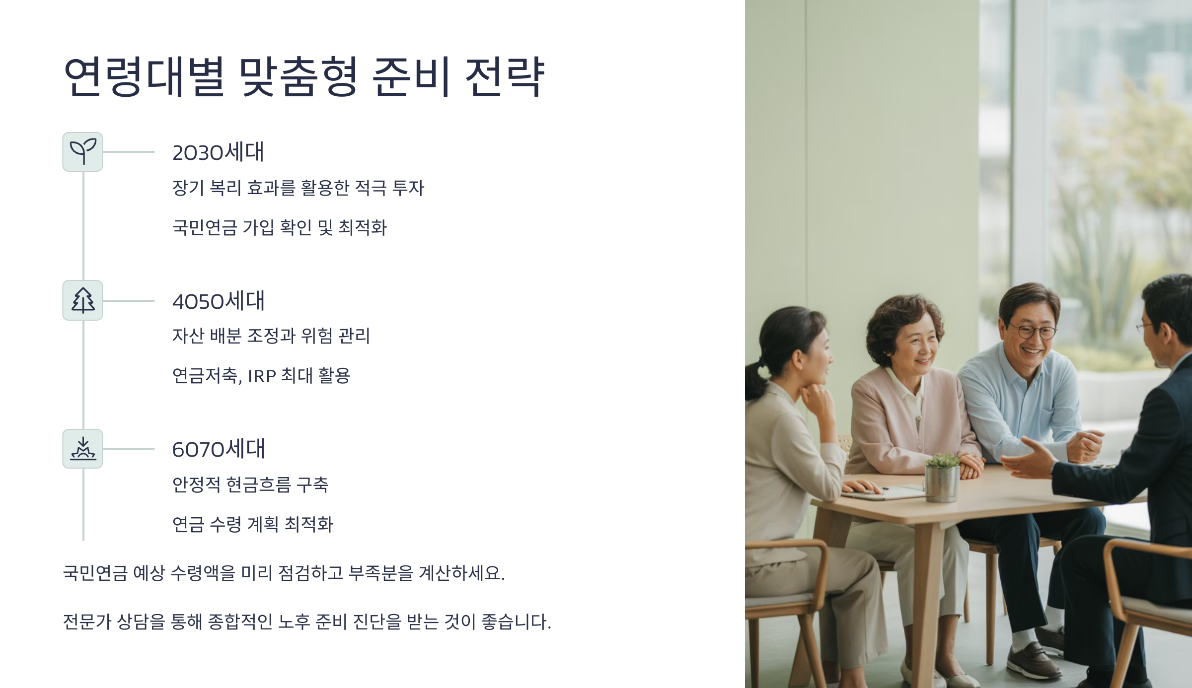 먼저 나이별로 계획을 다르게 세우는 게 좋아요. 예를 들어 30~40대에는 자산을 모으는 데 집중하고, 50대에는 자산을 재정비하고 리스크를 줄이는 전략이 필요하죠. 60대 이후에는 실현 가능한 생활 구조와 의료, 주거, 여가를 구체적으로 다듬는 단계에 들어가야 해요.