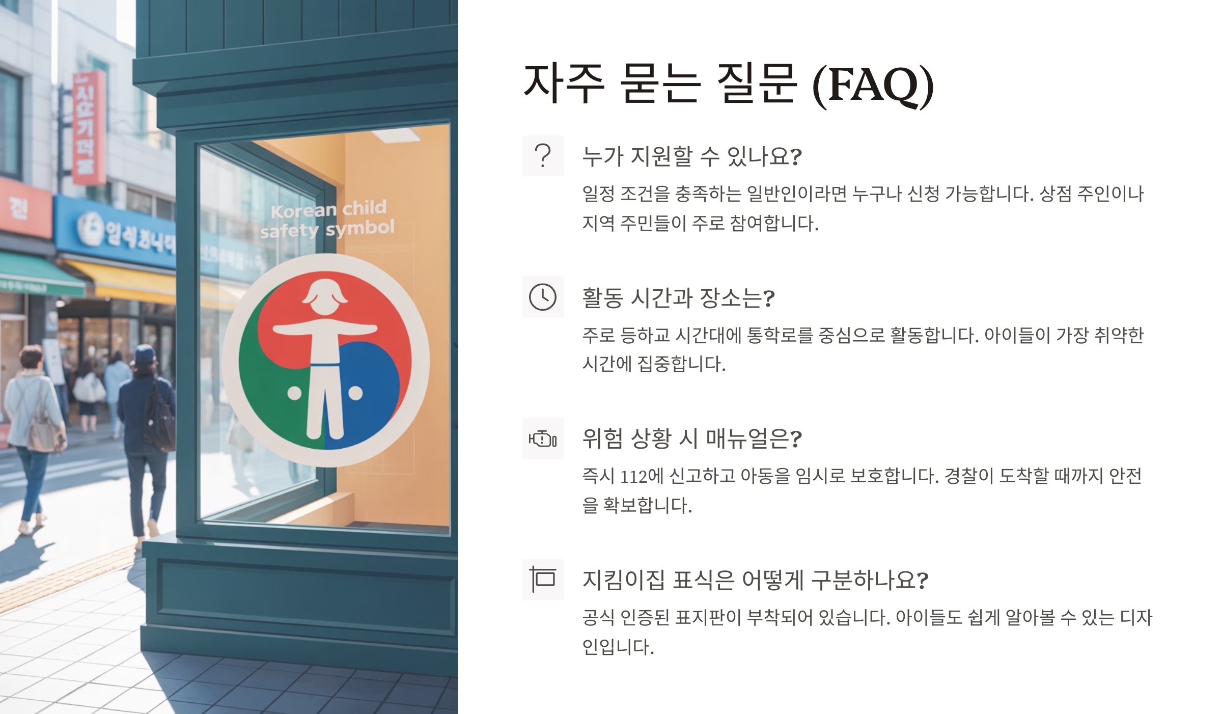 사회 전체의 인식 개선도 함께 이뤄져야 해요. 아직 일부 지역에서는 아동지킴이를 ‘감시자’처럼 보는 시선도 있고, 아이들 스스로 도움 요청을 어려워하는 경우도 있어요. 그래서 ‘도움을 주고받는 관계’로서 지킴이의 존재를 알리고, 아이들에게도 쉽게 접근할 수 있는 분위기가 만들어져야 해요.