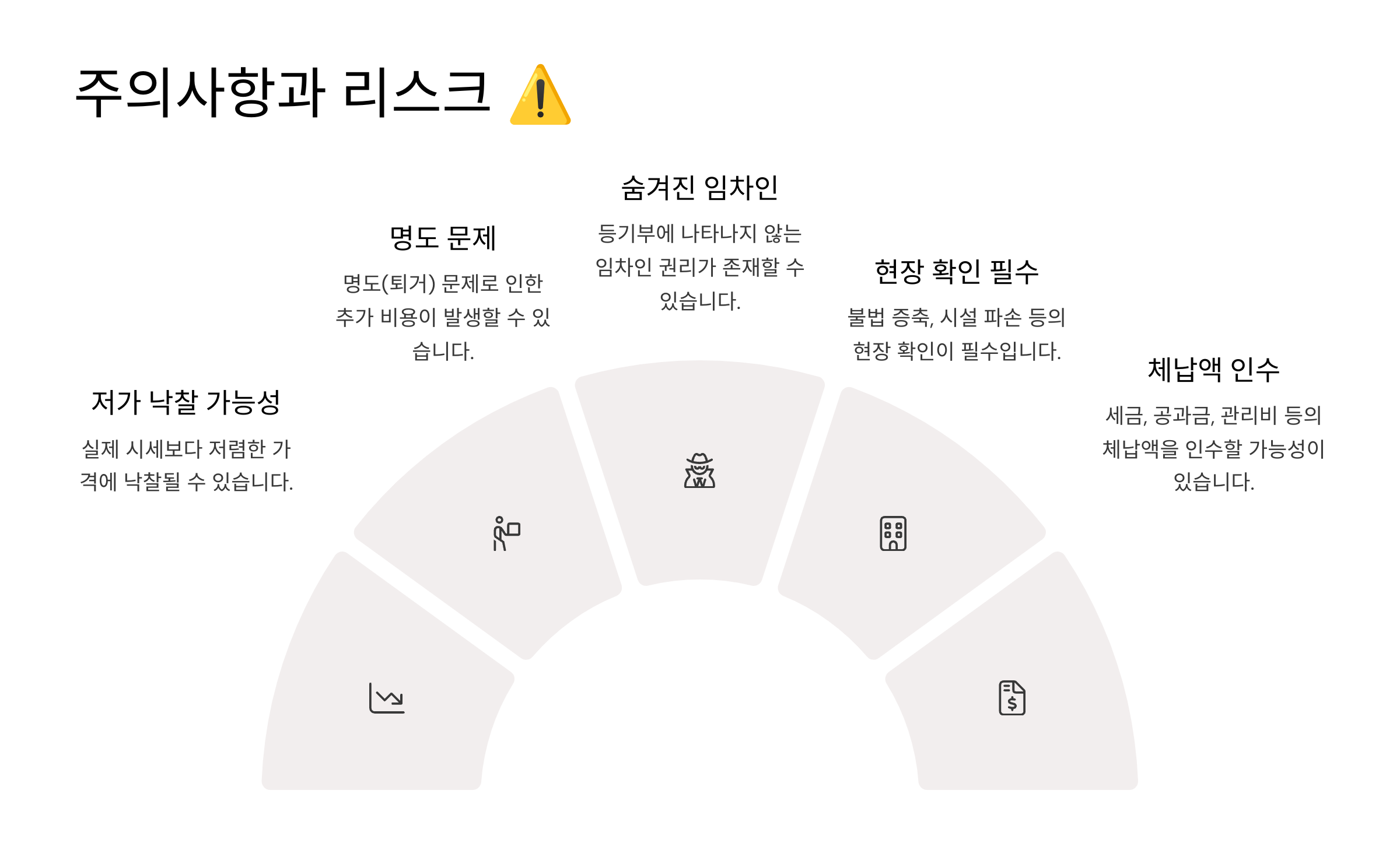 이제 마지막 섹션에서는 강제경매 시 꼭 알아야 할 주의사항과 리스크를 알려줄게요! ⚠
