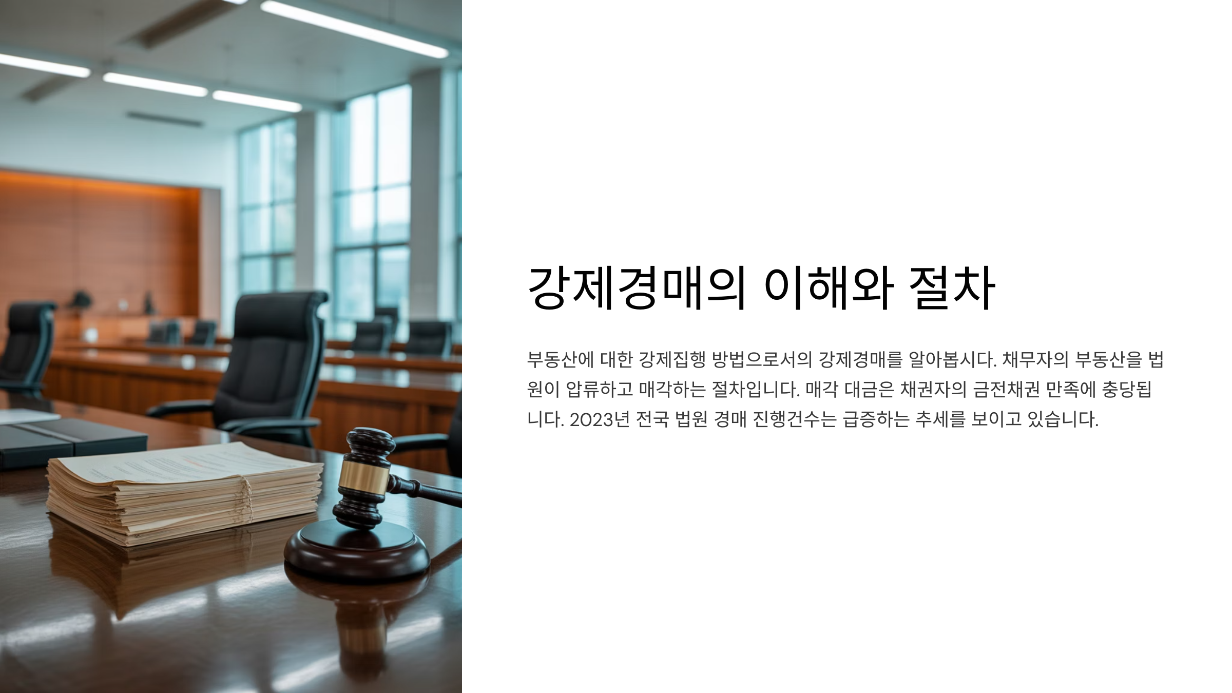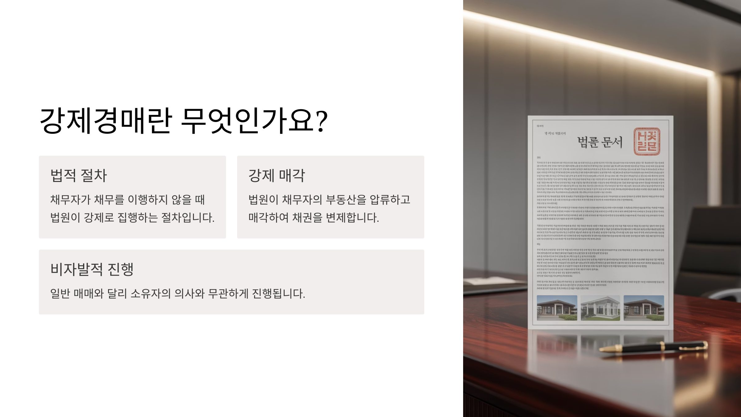 강제경매는 빚을 갚지 못한 채무자의 재산을 법원의 명령에 따라 경매에 부쳐 현금화하고, 그 돈으로 채권자가 빚을 회수하는 절차예요. 주로 부동산을 대상으로 하며, 이 과정은 복잡하고 법적 절차도 꼼꼼하게 따져야 하죠.
