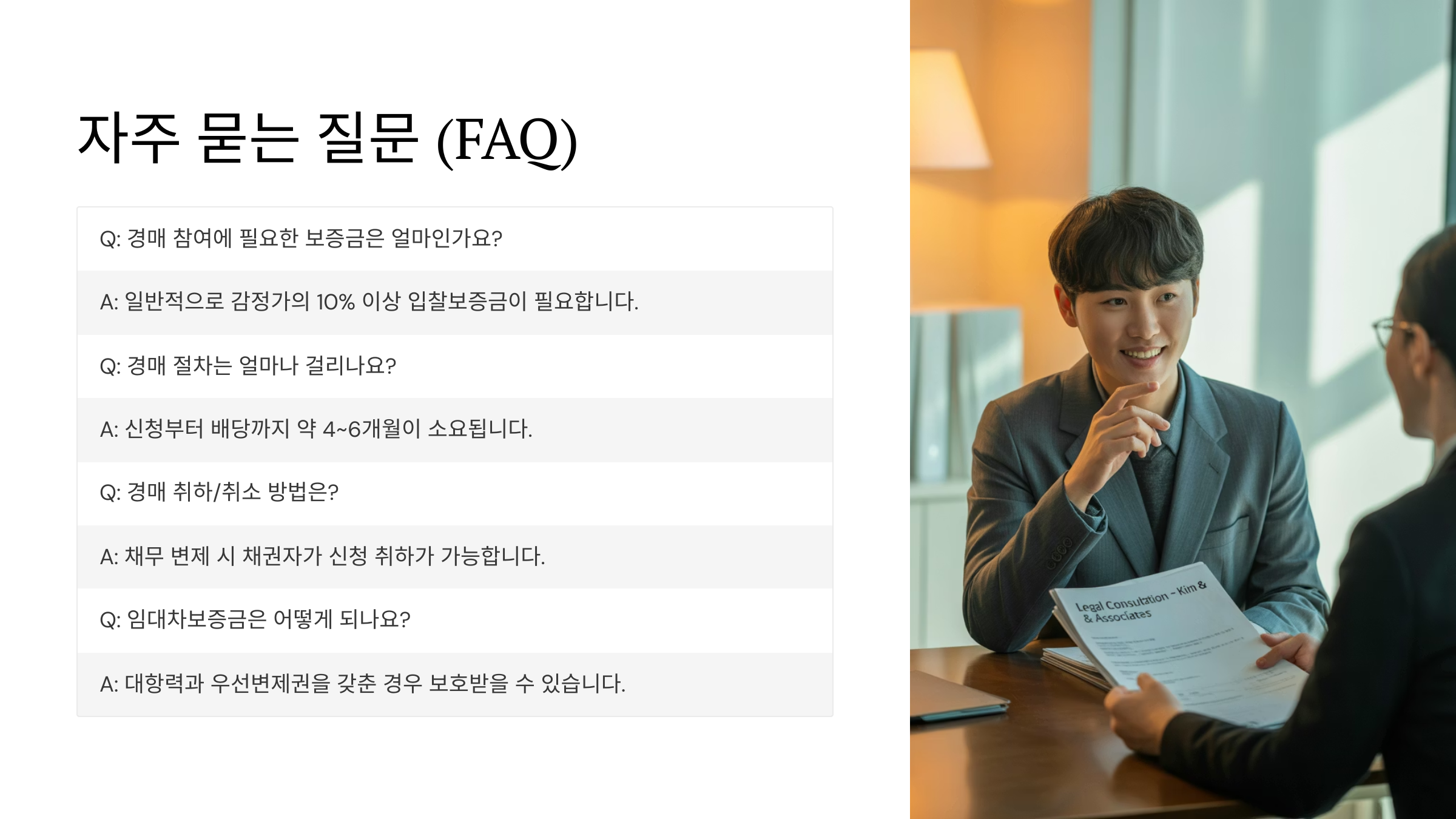 용어 의미 비고 집행권원 경매 신청에 필요한 법적 문서 판결문, 공정증서 포함 채무자 돈을 갚아야 할 사람 재산 경매 대상자 채권자 돈을 받을 권리가 있는 사람 경매 신청자 배당요구 경매 대금에서 배분 요청 다른 채권자도 참여 가능 경매개시결정 법원이 경매 시작을 허락함 공시로 효력 발생 이렇게 주요 개념을 알아두면 강제경매를 더 쉽게 이해할 수 있어요. 특히 집행권원은 강제경매를 시작하기 위한 핵심 문서이니 꼭 기억해두세요! 📝