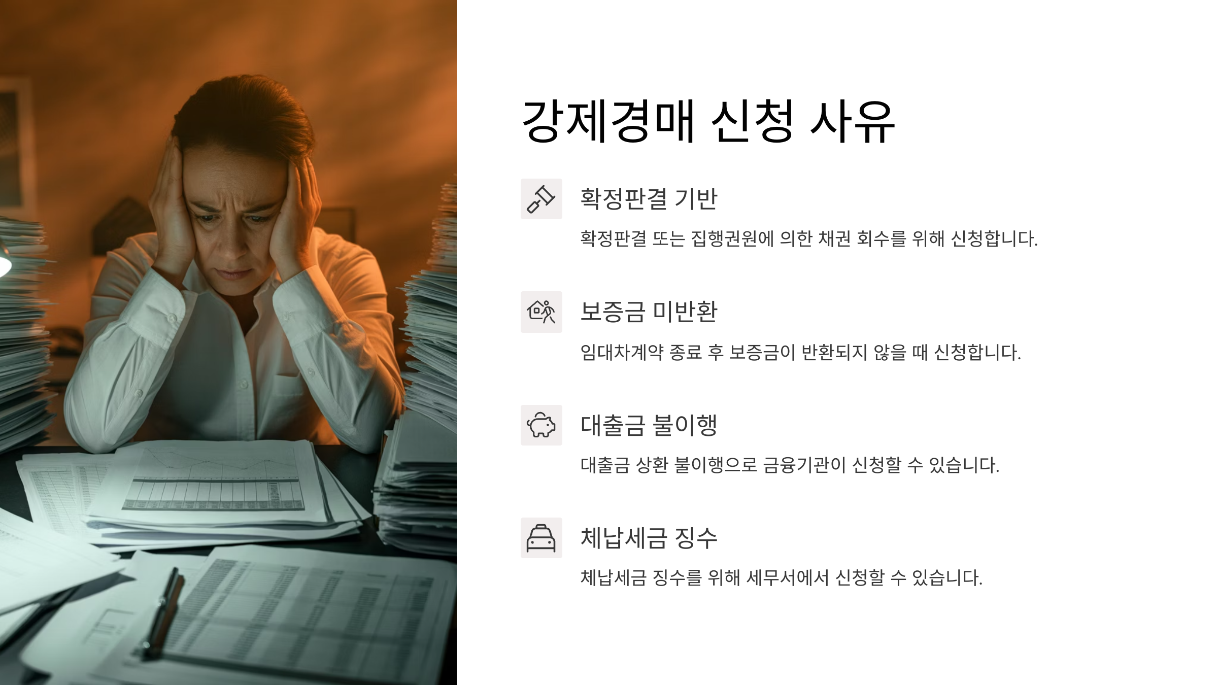 이제 다음 박스에서는 강제경매를 신청할 수 있는 구체적인 사유와 예시들을 살펴볼게요. 😎