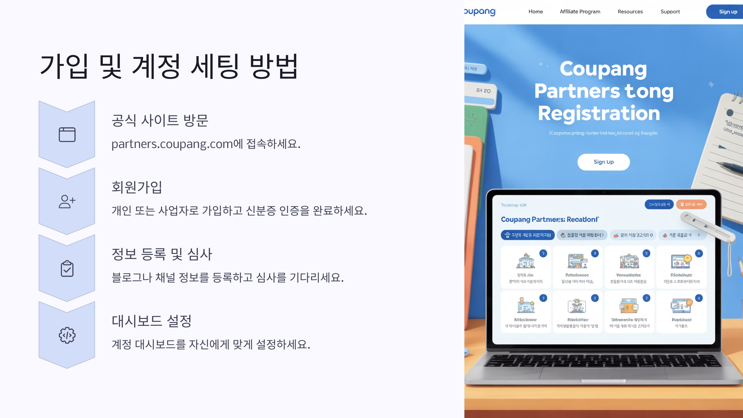 📌 가입 절차 1⃣ [쿠팡 파트너스](https://partners.coupang.com/) 접속 2⃣ 카카오 or 네이버 간편 로그인 3⃣ 홍보 채널 등록 (블로그, SNS, 유튜브 중 1개 필수) 4⃣ 계좌정보 입력 → 승인 완료 후 바로 링크 생성 가능