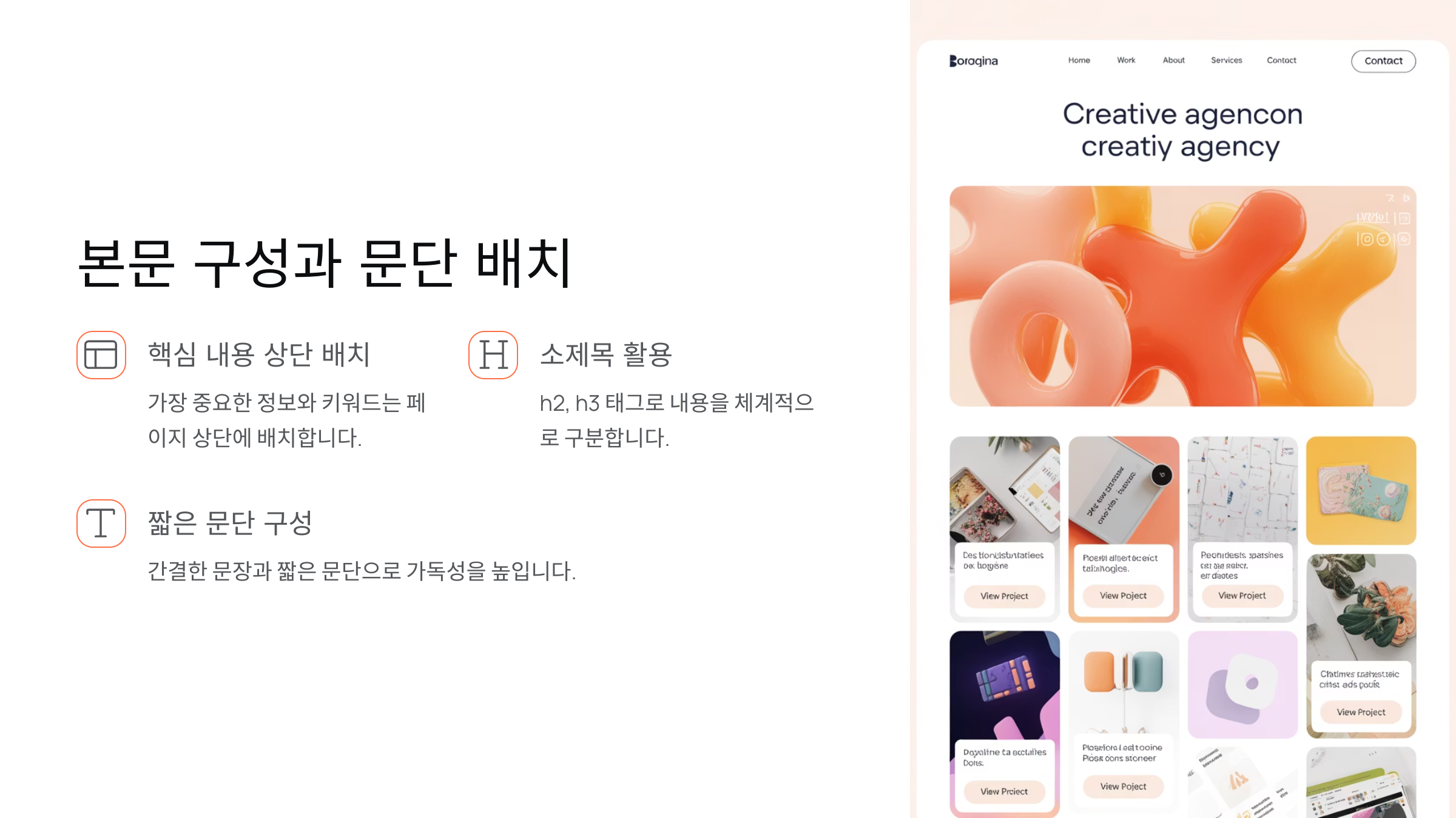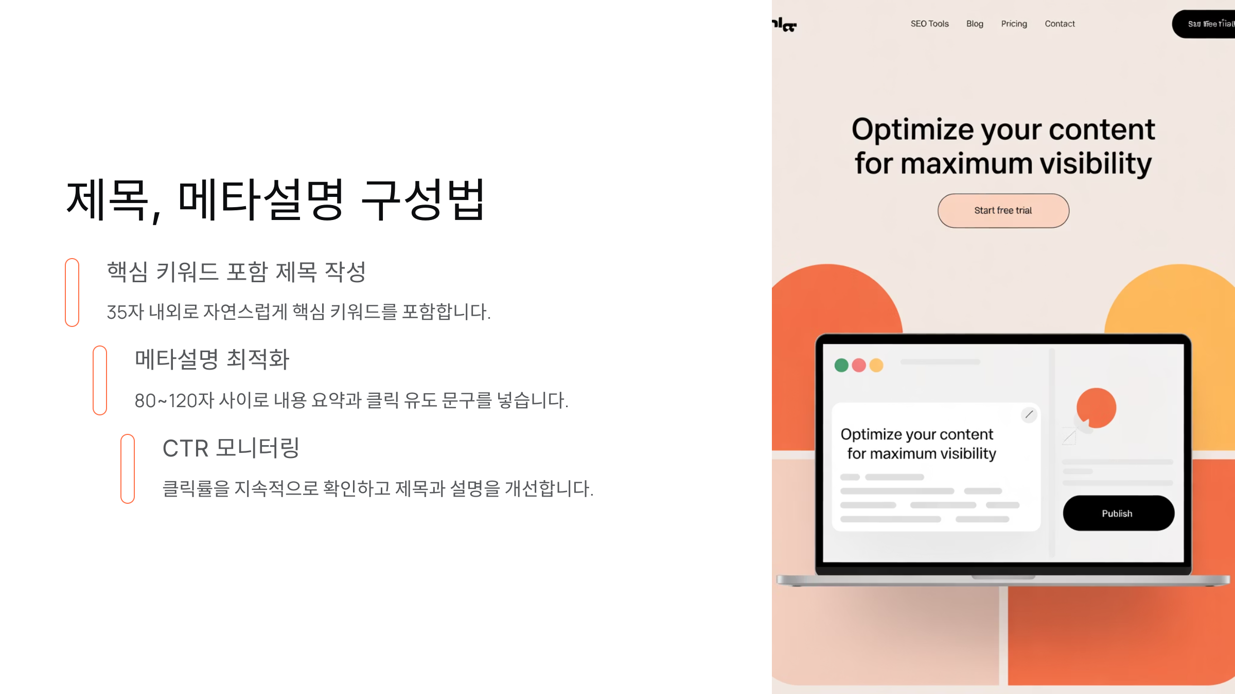 본문은 단순히 길게 쓰는 게 아니라, ‘검색 알고리즘이 좋아하는 구조’로 짜야 해요. 특히 첫 문단과 중간 제목, 문단 간 구분이 정말 중요해요! ✍🧱 본문 구성 포인트 - 1단락: 키워드 포함된 요약문 (서론) - 2~3단락: 정보 제공 + 예시 삽입 - 중간 제목(h2~h3): 관련 키워드 포함 - 리스트 & 번호 사용해 가독성 ↑ - 마지막 단락: CTA(Call to Action) or 요약정리