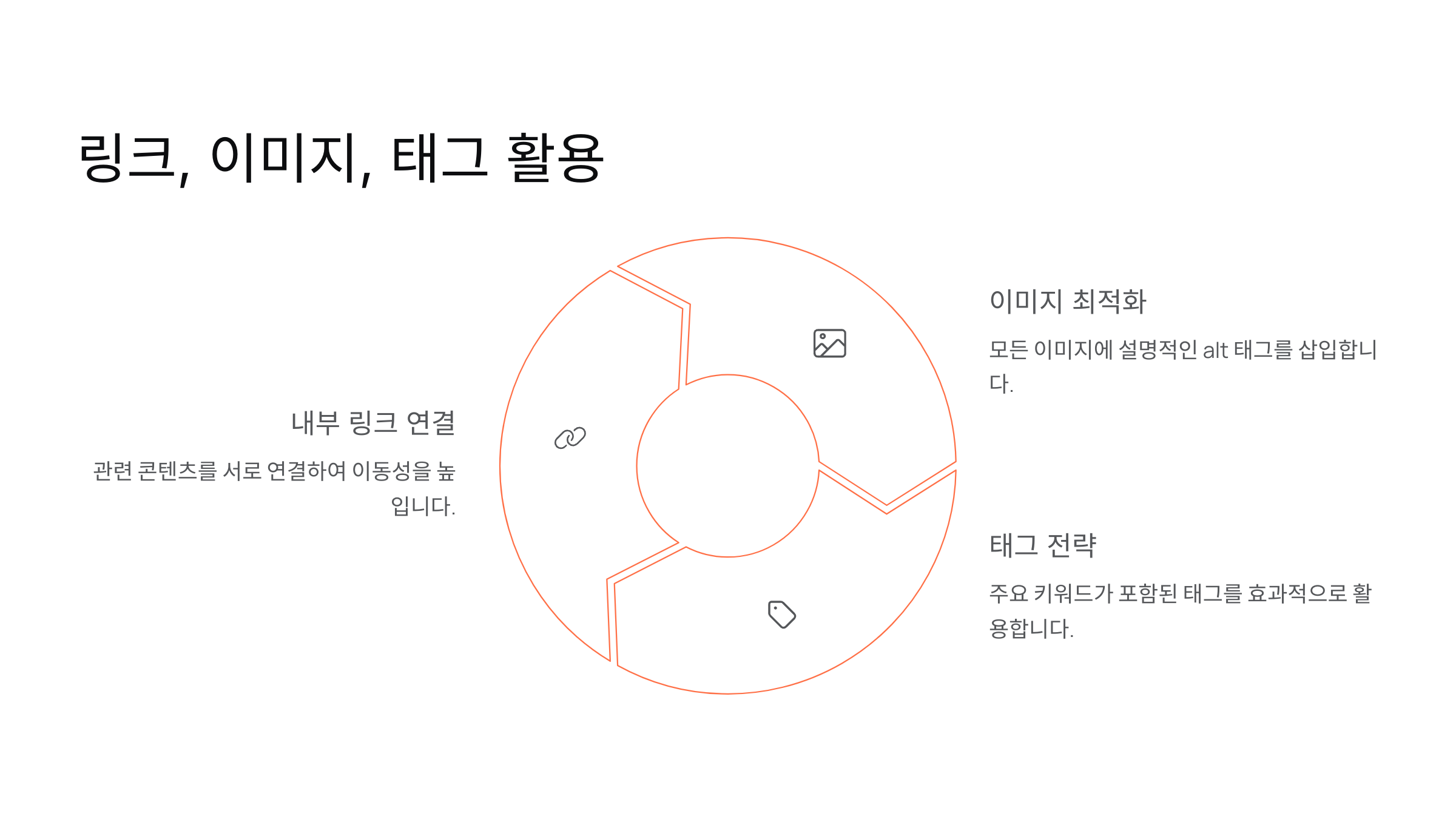 검색엔진은 단어뿐 아니라 ‘글의 구성요소’도 체크해요. 이미지, 내부 링크, 외부 링크, 태그까지 잘 활용해야 SEO 효과가 높아져요. 🌐📎 활용 가이드 - 이미지: 2~3장, alt 태그 넣기 - 외부 링크: 공식 자료, 신뢰도 높은 사이트 연결 - 내부 링크: 내 블로그 다른 글 연결 (ex. 관련 글 보기) - 태그: 3~5개, 핵심 키워드 위주