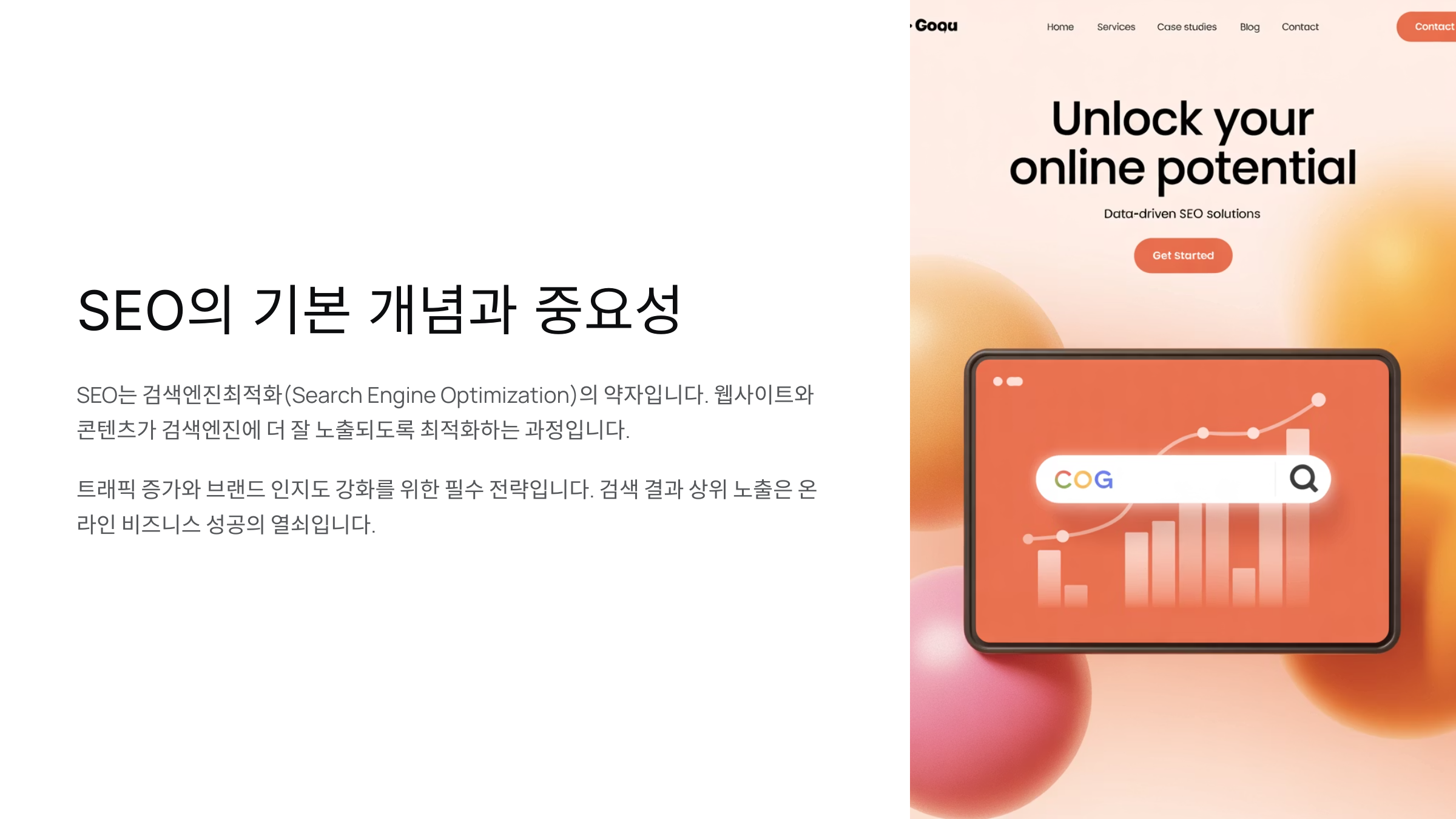 SEO(Search Engine Optimization)는 검색 엔진 최적화예요. 쉽게 말해 ‘구글이나 네이버가 좋아하는 글쓰기 방식’이라고 이해하면 돼요. 검색 결과 상위에 내 글이 노출되게 하는 기술이죠.블로그 SEO는 단순히 키워드 많이 넣는 게 아니에요. 콘텐츠의 구조, 제목, 본문, 링크, 태그, 글 발행 시간까지 모두 검색 알고리즘에 영향을 줘요!