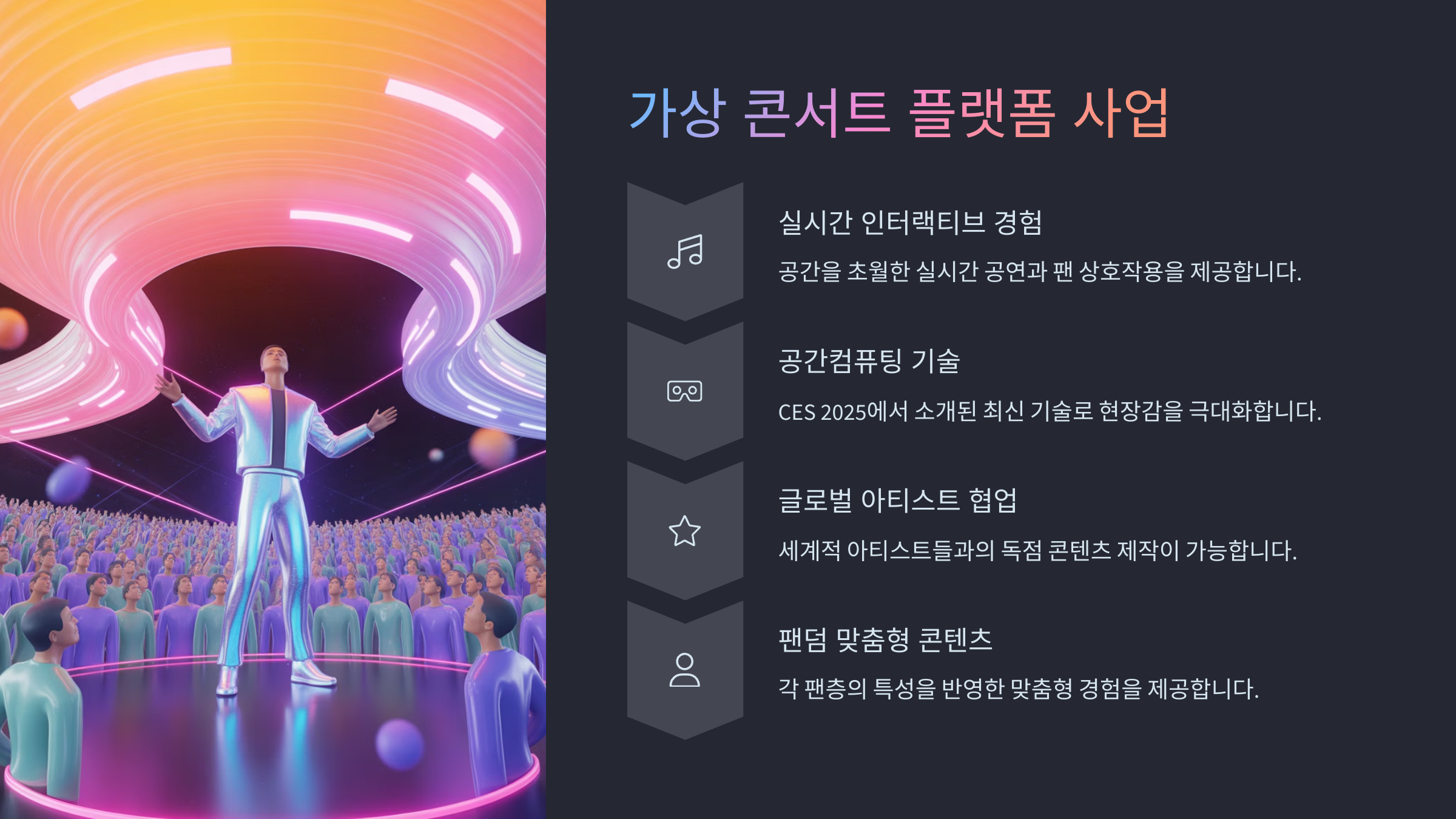 가상 콘서트 플랫폼 사업 가상 콘서트 플랫폼은 메타버스에서 가장 뜨거운 사업 아이디어 중 하나예요. 팬들은 물리적 거리 제약 없이 좋아하는 가수의 공연을 실시간으로 즐길 수 있죠. 2025년 현재, BTS, 블랙핑크 같은 글로벌 스타들도 메타버스 콘서트를 개최하며 대중과 소통하고 있어요.