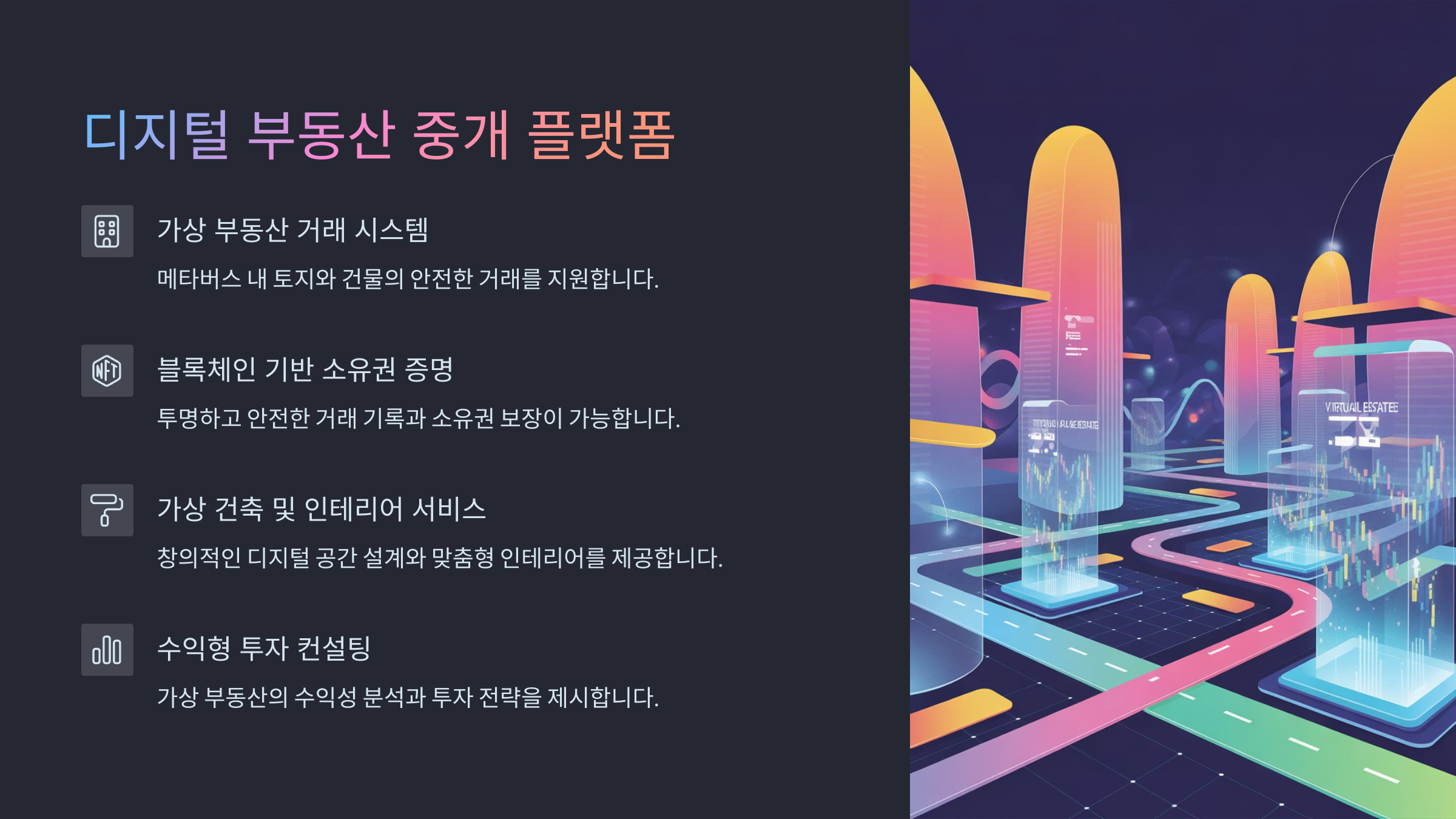 디지털 부동산은 메타버스 세상 속에서 토지, 건물, 상업공간 등을 사고파는 것을 의미해요. 현실 세계처럼 땅을 사고 건물을 올리고 임대수익을 얻는 비즈니스가 가상세계에서도 가능해졌어요. 2025년 기준, '디센트럴랜드', '더 샌드박스' 같은 플랫폼에서는 이미 수십억 원대 가상 부동산 거래가 활발히 이뤄지고 있답니다.디지털 부동산 시장이 커지면서 자연스럽게 부동산 중개 플랫폼의 필요성도 증가했어요. 사람들이 안전하고 신뢰할 수 있는 방법으로 가상 토지를 사고팔 수 있도록 돕는 서비스가 필수가 된 거죠. 이런 플랫폼을 사업화하면 큰 기회를 잡을 수 있어요.