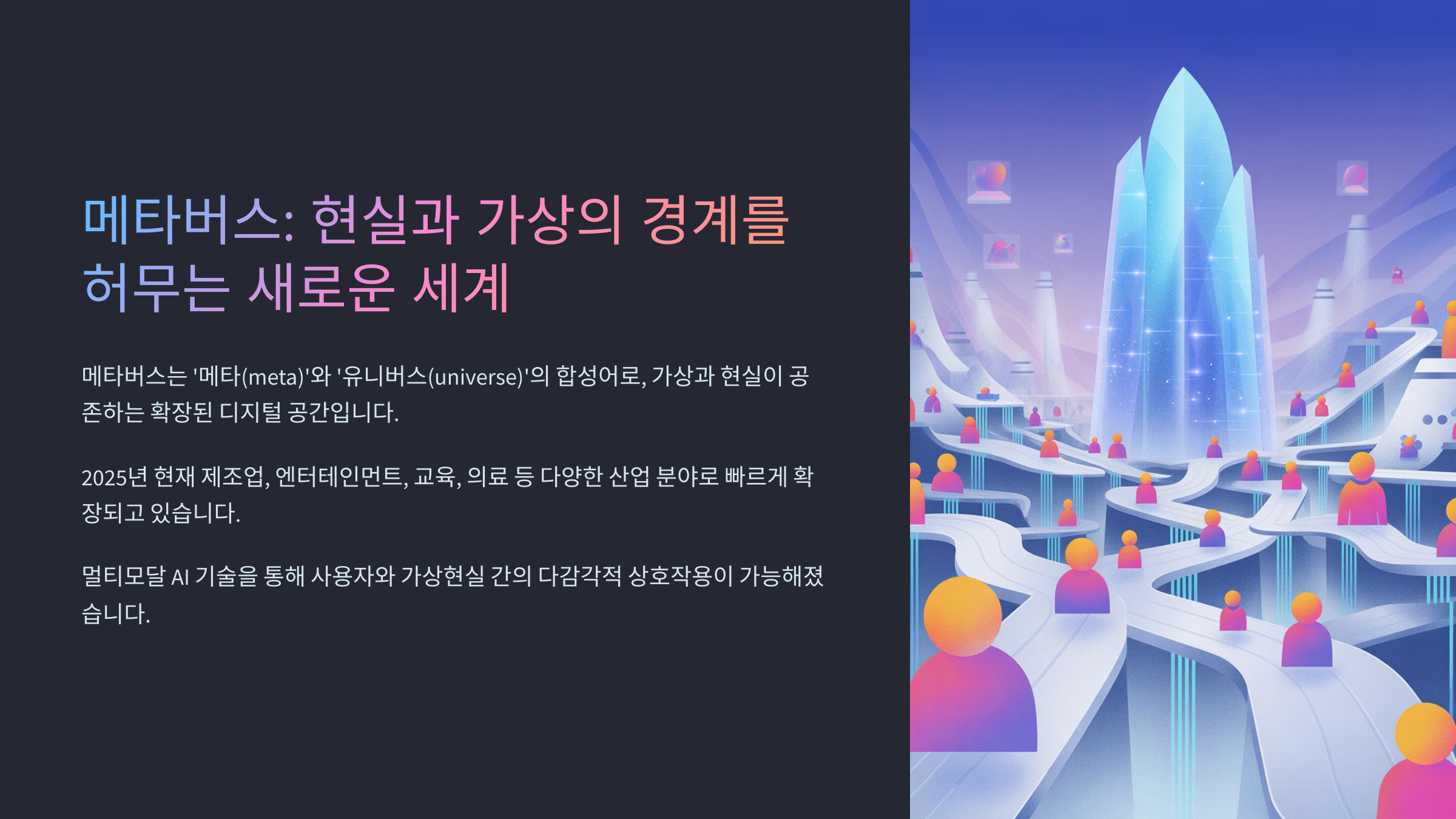 메타버스는 'Meta(초월)'와 'Universe(우주)'를 합친 말로, 가상세계에서 다양한 활동을 할 수 있는 공간을 의미해요. 가상현실(VR), 증강현실(AR), 블록체인, 인공지능(AI) 등 다양한 기술이 융합된 결과물이기도 해요.2025년 현재 메타버스는 단순한 게임 플랫폼을 넘어, 비즈니스, 교육, 의료, 공연 등 다양한 분야에 활용되고 있어요. 사람들은 이제 메타버스 안에서 쇼핑하고, 수업을 듣고, 친구들과 만나며 일상을 이어가기도 하죠.