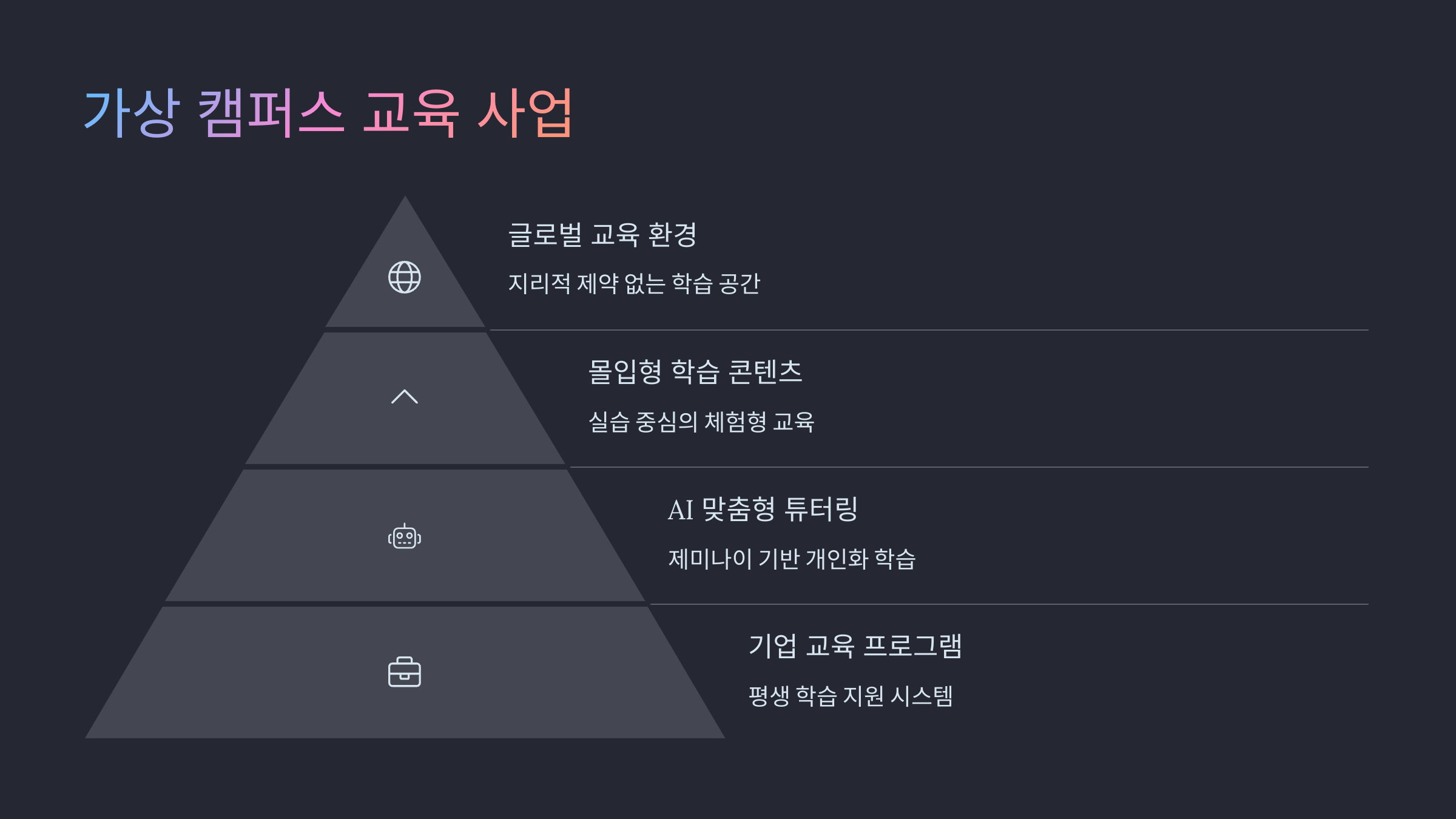 사업 아이디어로는 메타버스 기반 전용 교육 플랫폼 구축, 맞춤형 가상 강의실 제작 서비스, 글로벌 학생 대상의 원격 학위 과정 운영 등을 생각해볼 수 있어요. 또한, 수료증이나 학위를 NFT 형태로 발급하면 차별화된 가치를 제공할 수 있어요.