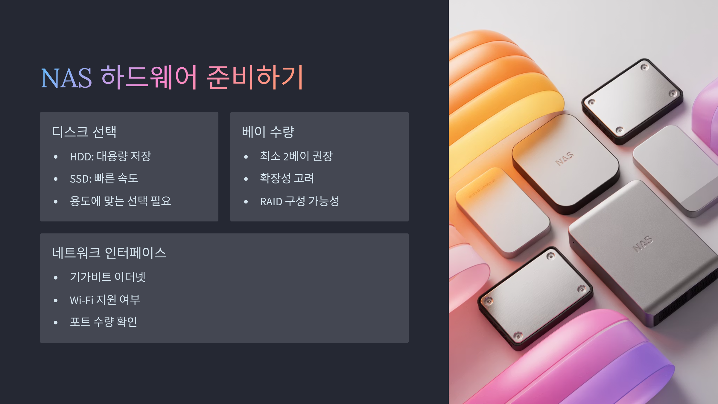 이처럼 NAS 설치를 위해서는 단순히 장비만 사는 게 아니라, 전체 시스템 환경을 고려하는 게 중요해요. 준비가 잘 되어 있으면 이후의 설치 과정도 훨씬 매끄럽게 진행될 수 있어요 😊