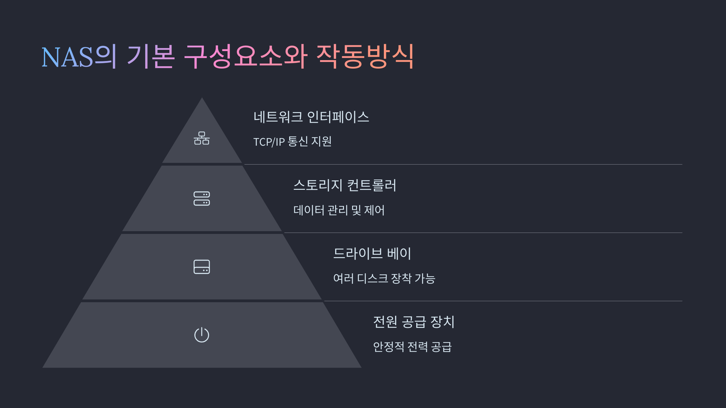 기본적으로 NAS는 운영체제(OS)가 내장되어 있고, 웹 브라우저나 앱을 통해 접근할 수 있어요. Synology, QNAP, ASUS 등 다양한 제조사에서 다양한 용도의 NAS를 판매하고 있답니다. 요즘은 초보자용 GUI 환경이 잘 구성되어 있어 누구나 쉽게 사용할 수 있어요.