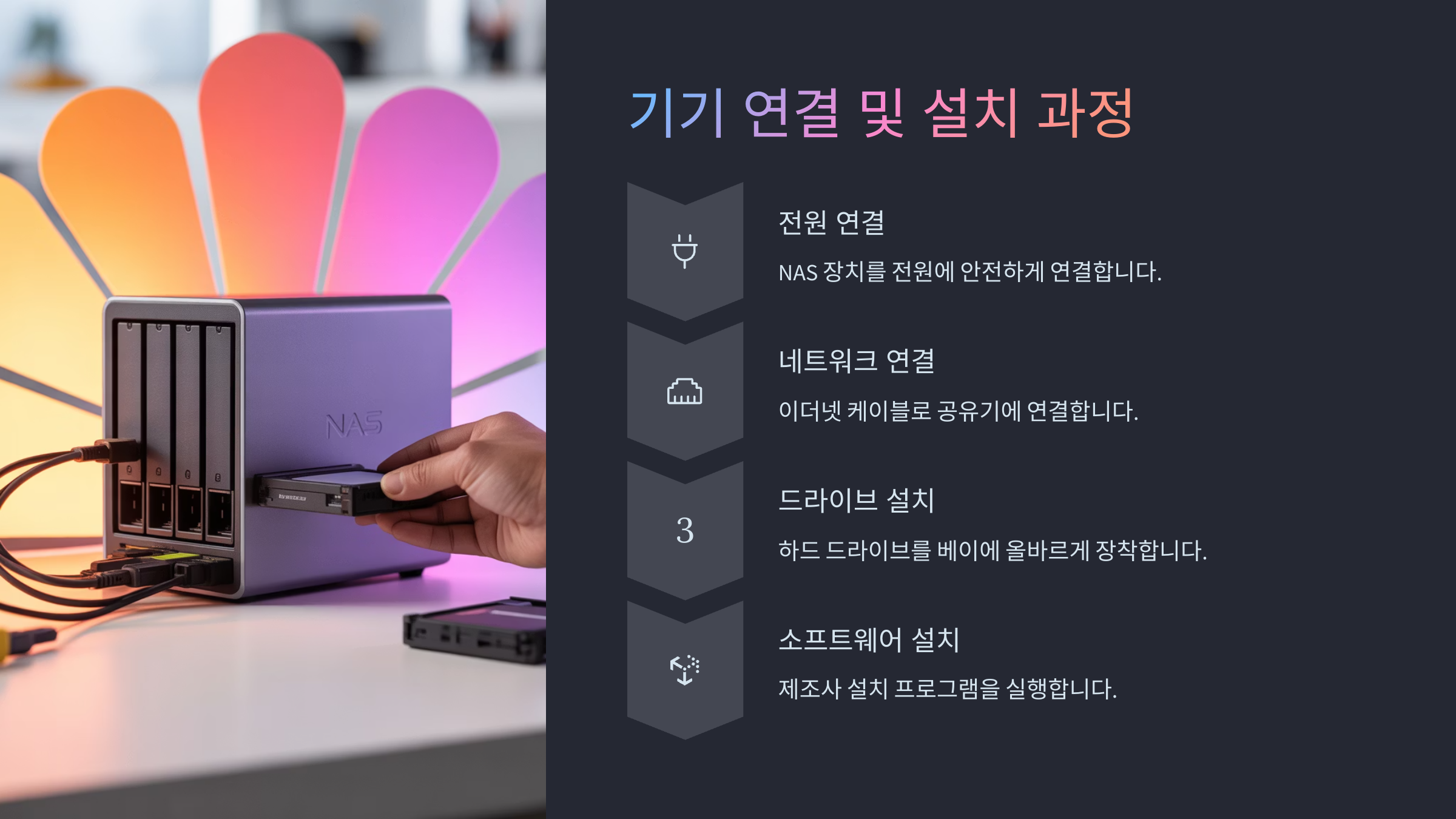 단계 설명 1. 하드디스크 장착 NAS 베이에 HDD 삽입 및 고정 2. 케이블 연결 전원 및 이더넷 케이블 연결 3. 전원 부팅 전원 버튼으로 NAS 가동 4. 초기 접속 브라우저에서 NAS 주소 접속 5. OS 설치 운영체제 및 펌웨어 설치 6. 관리자 설정 이름, 비밀번호, 시간대 설정 7. NAS 사용 시작 웹 UI로 설정 완료 후 사용 시작 이 표처럼 설치 순서를 따라가면 훨씬 수월하게 설치할 수 있어요. 어려울 것 같지만 한 단계씩 해보면 생각보다 간단하답니다!