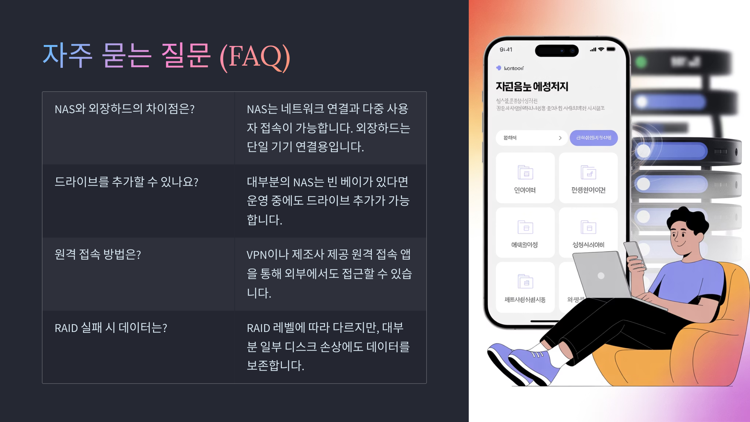 NAS는 일반 가정에서 쓰기에도 좋고, 소규모 사무실에서도 생산성과 데이터 보호 측면에서 유용하게 사용될 수 있어요. 요즘엔 보안 기능도 강화되어 안심하고 쓸 수 있답니다.