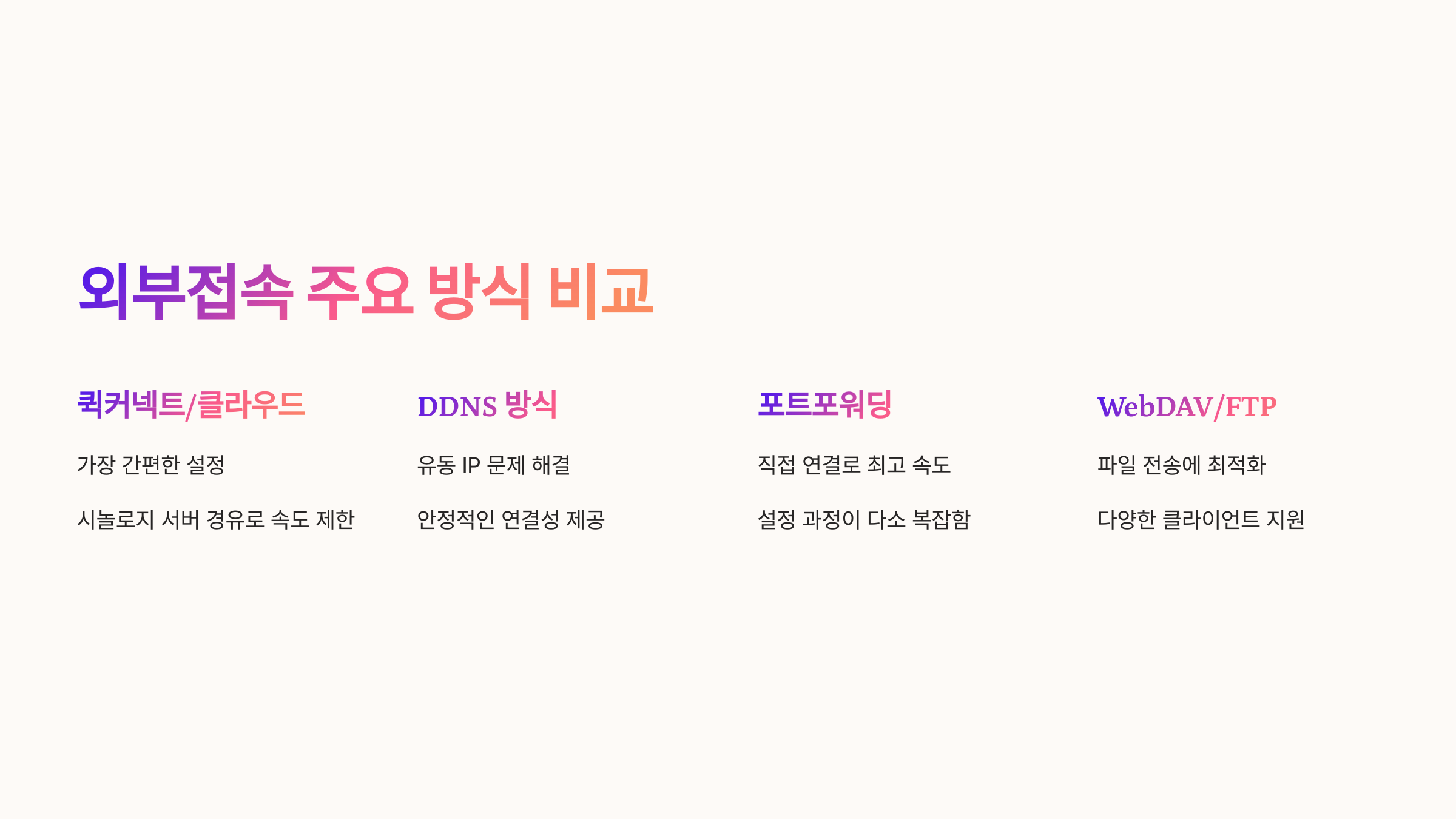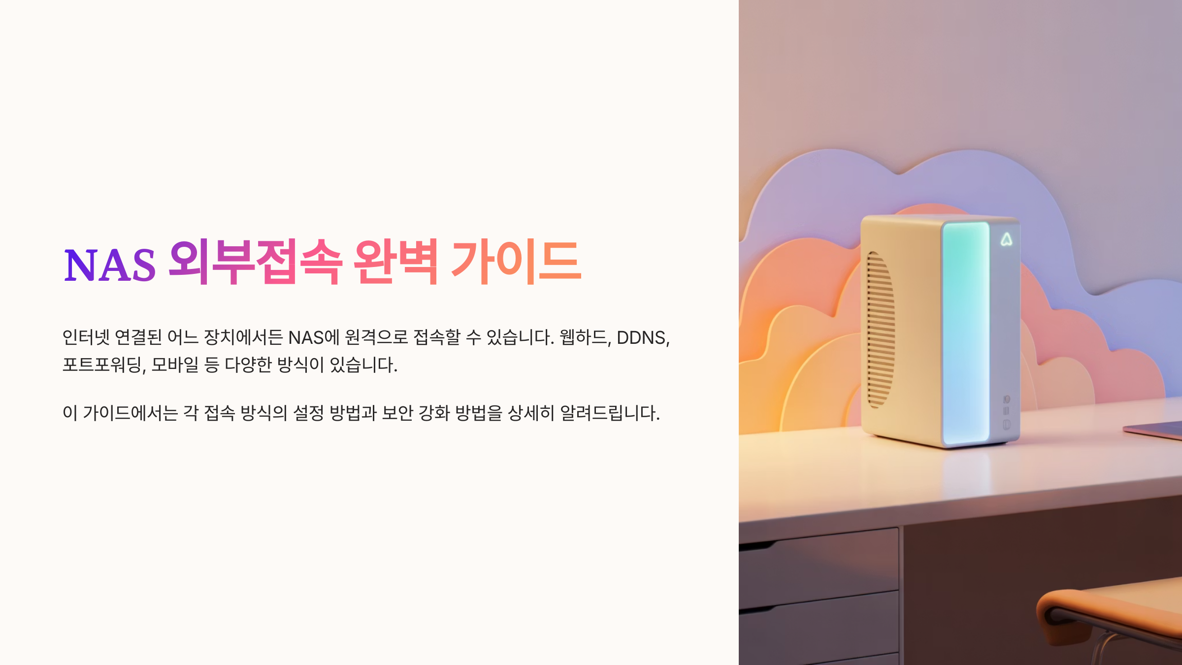 이제 본격적으로 NAS 외부접속 설정 방법을 소개할게요! 아래 박스들을 따라 하나씩 설정하면 누구나 쉽게 외부 접속을 완료할 수 있어요. 그럼 시작해볼까요? 😎