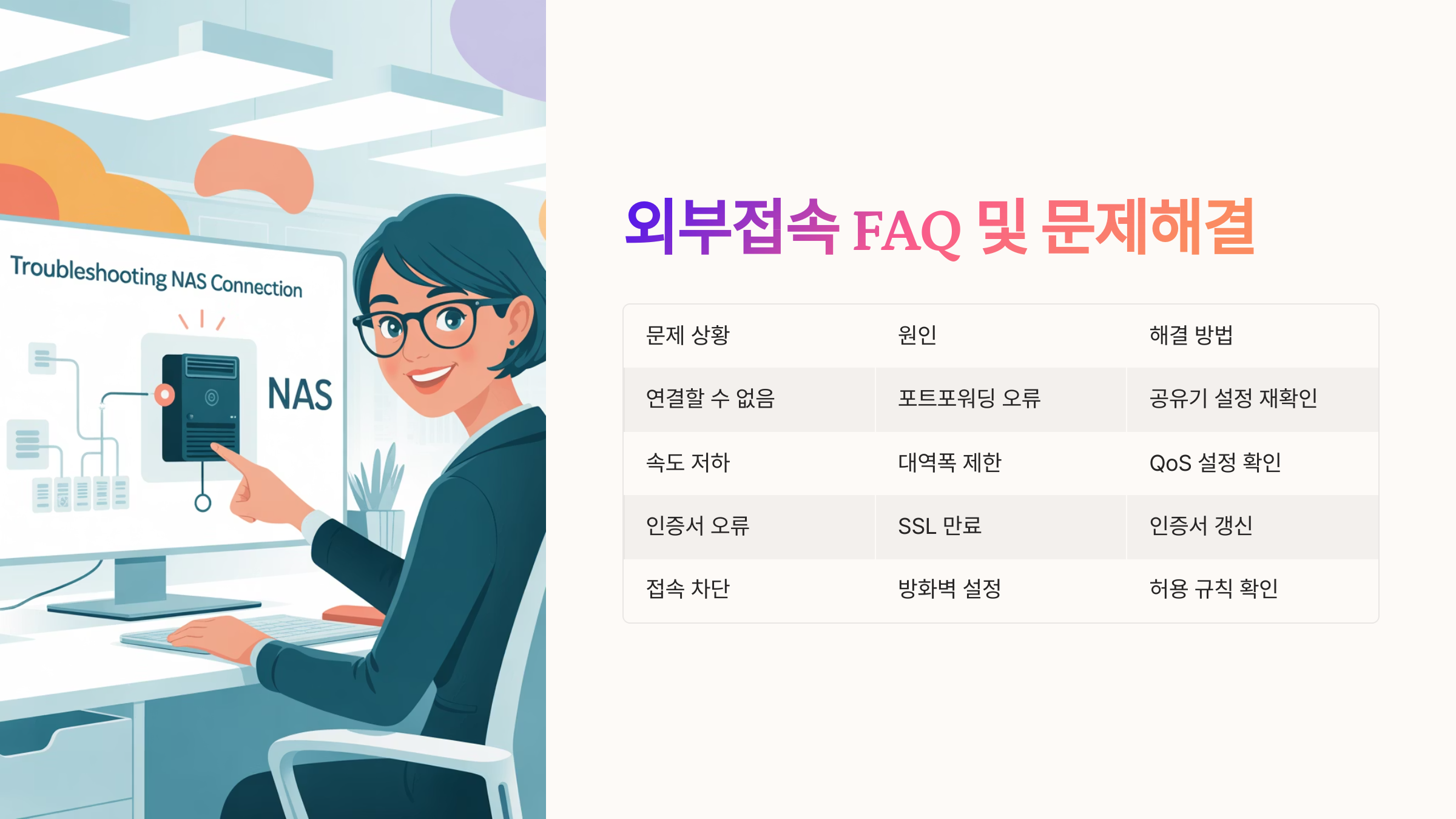 마지막으로 많이들 궁금해하는 NAS 외부접속에 대한 질문들을 FAQ 형식으로 정리해볼게요! 실시간으로 많이 찾는 질문만 쏙쏙 골라서 알려줄게요! 🧠