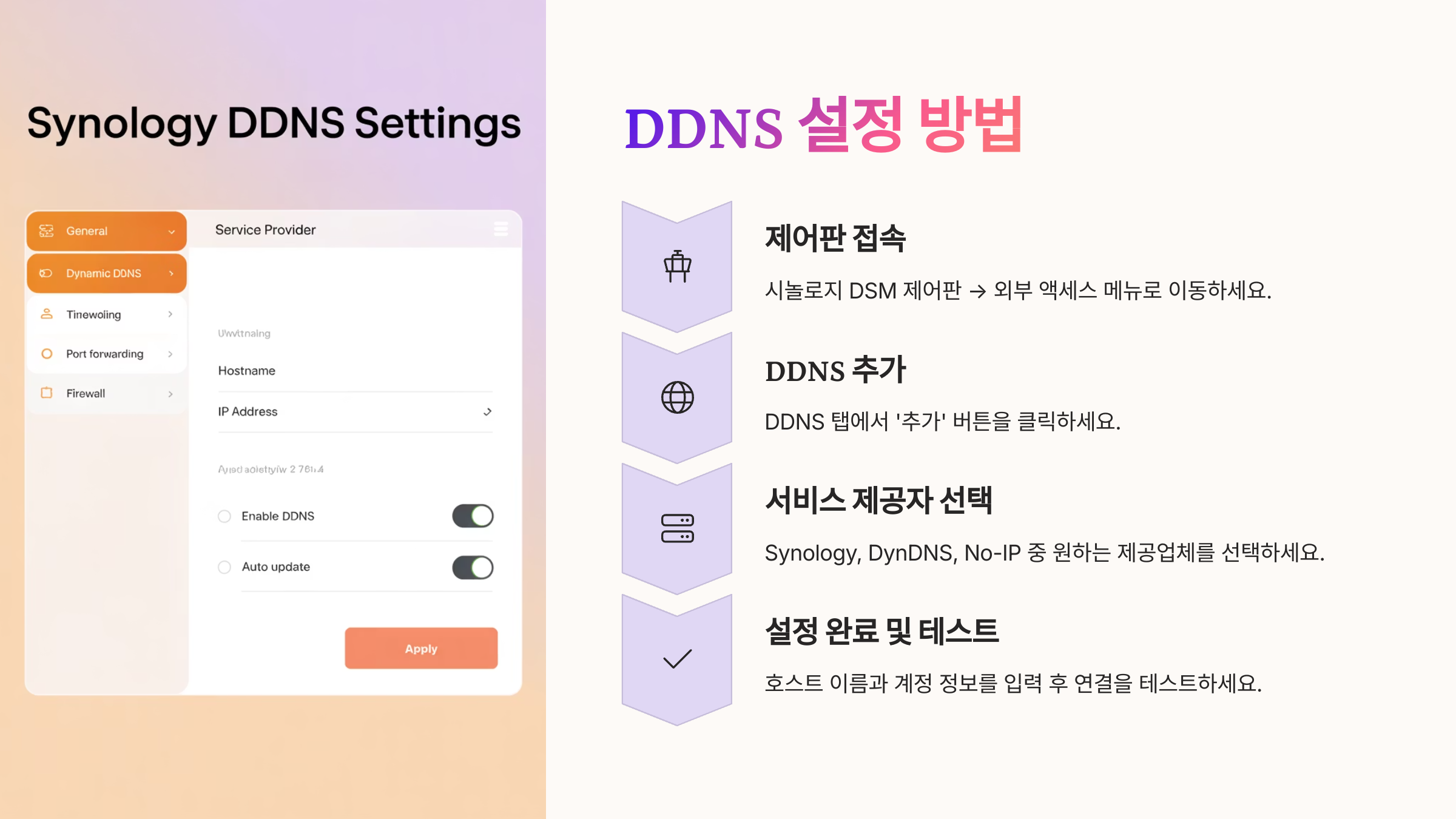 설정 방법은 간단해요. DSM(관리화면)에서 제어판 → 외부 접근 → DDNS로 이동한 뒤, ‘서비스 제공자’를 선택하고 원하는 도메인 이름을 입력해요. 그다음 ‘테스트’를 눌러 연결 확인 후 저장하면 끝이에요. 이렇게 하면 내 NAS는 항상 같은 주소를 유지할 수 있어요.