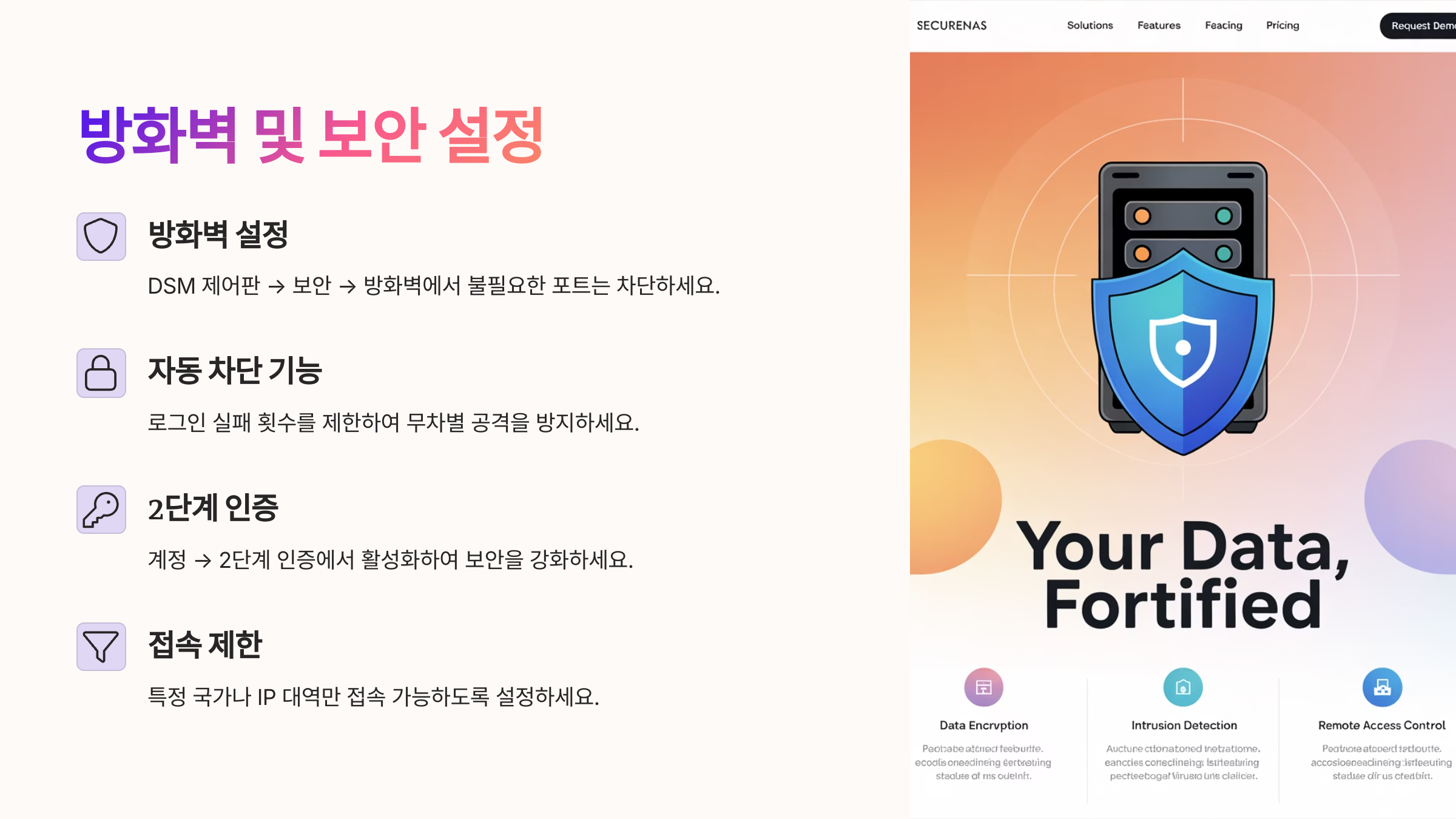 NAS 대부분에는 자체 방화벽 기능이 있어요. Synology NAS를 기준으로 보면, 제어판 → 보안 → 방화벽 설정으로 들어가서 IP 범위나 포트에 따라 허용/차단 규칙을 만들 수 있어요. 예를 들어 내 핸드폰이나 사무실 IP만 접속 허용하는 것도 가능해요.