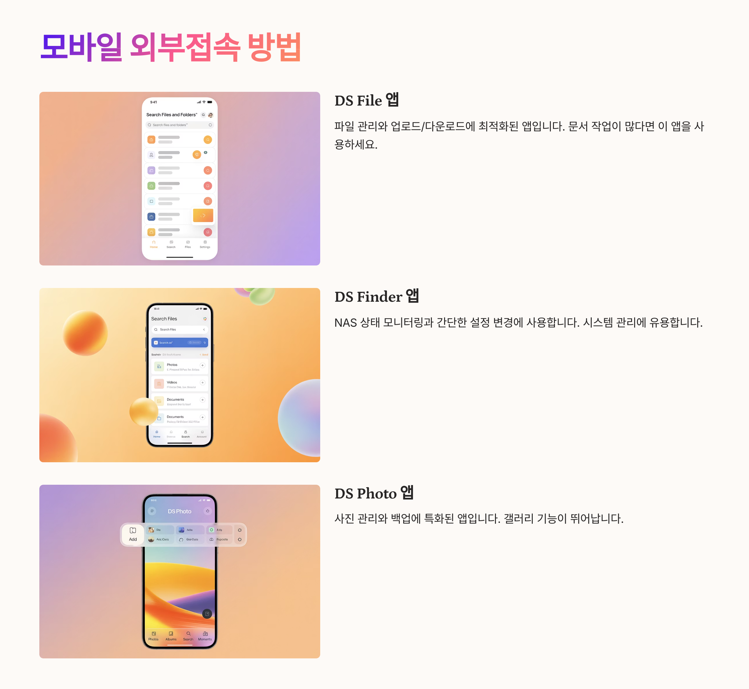 앱 이름 주요 기능 지원 OS 보안 접속 DS file 파일 탐색, 업/다운로드 iOS, Android HTTPS 지원 DS photo 자동 사진 백업, 앨범 관리 iOS, Android HTTPS 지원 DS audio 음악 스트리밍, 재생목록 관리 iOS, Android HTTPS 지원 DS cam CCTV 실시간 확인, 녹화 영상 보기 iOS, Android HTTPS 지원 앱을 설치하고 설정을 마치면, 언제 어디서든 NAS를 내 스마트폰처럼 쓸 수 있어요. 사진 정리나 업무용 문서 다운로드, 음악 감상까지 모두 가능하죠. 이제 거의 모든 설정이 끝났어요!