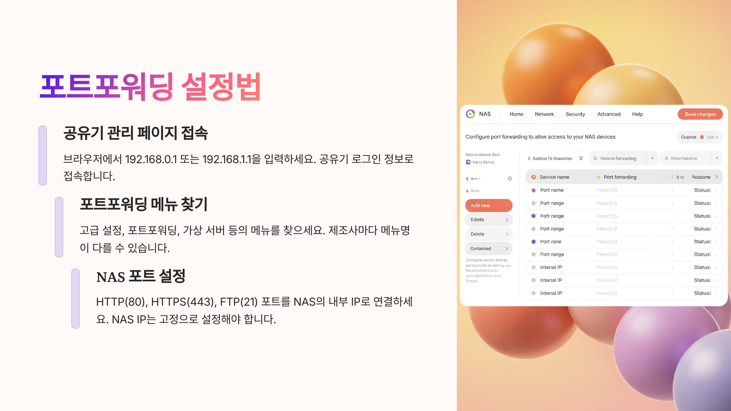 설정 방법은 공유기 제조사마다 조금씩 다르지만, 공통적인 흐름은 있어요. 일반적으로는 '고급 설정 > 포트포워딩' 메뉴에서 외부 포트(예: 5000), 내부 포트(예: 5000), 내부 IP(NAS 주소)를 입력하고 저장하면 설정 완료예요. 공유기 비밀번호를 모르면 설정이 어려우니 미리 알아두는 게 좋아요!