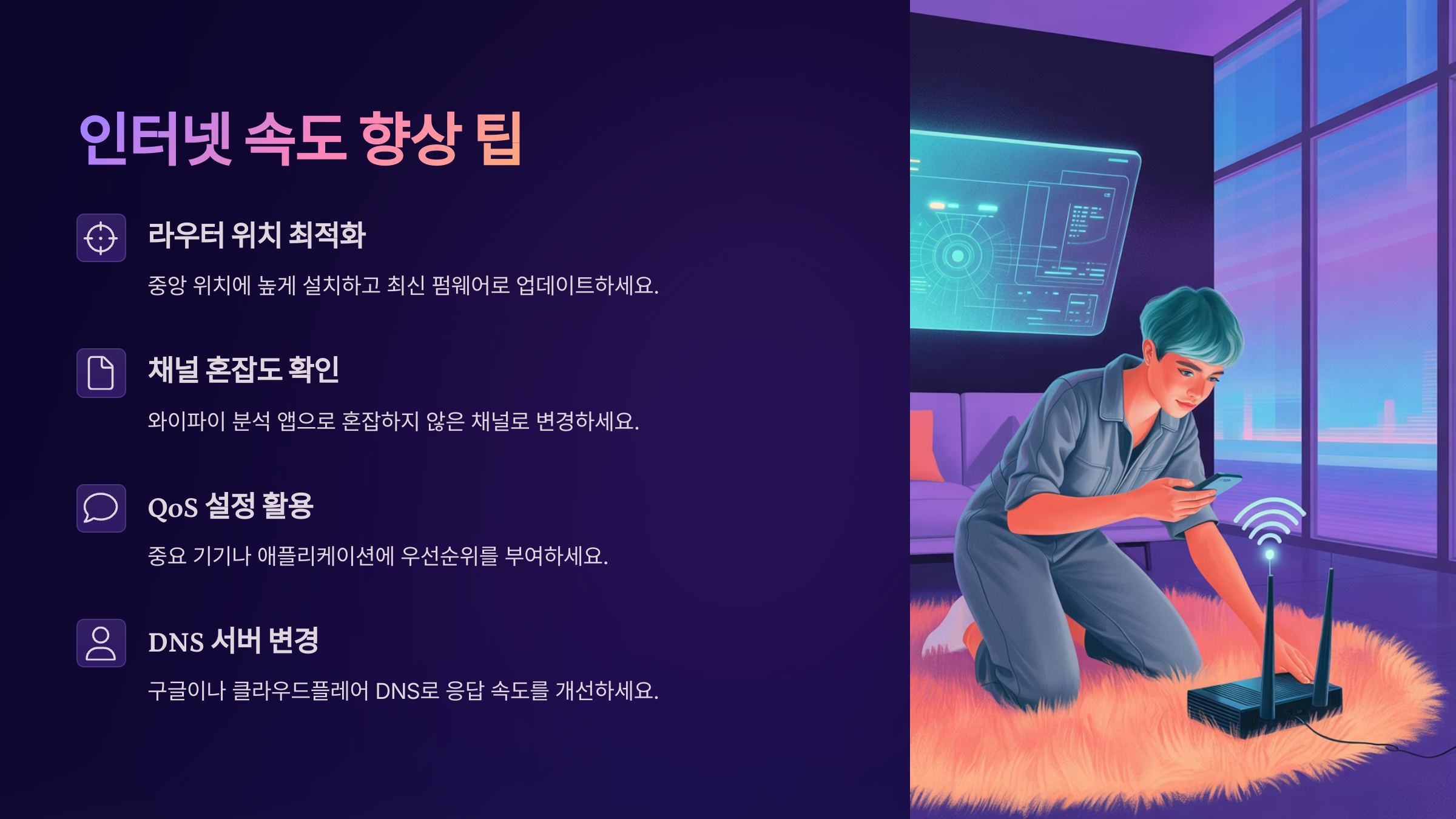 인터넷 속도를 조금이라도 높이고 싶다면 몇 가지 실용적인 팁이 있어요. 가장 먼저 시도해볼 수 있는 건 공유기 재부팅이에요. 간단하지만 효과적이죠!다음은 공유기의 위치를 바꾸는 거예요. 가능한 한 집 중앙, 장애물 없는 곳에 두면 전파가 고르게 퍼져서 신호가 더 잘 잡혀요. 벽 가까이나 바닥에 두는 건 좋지 않아요.