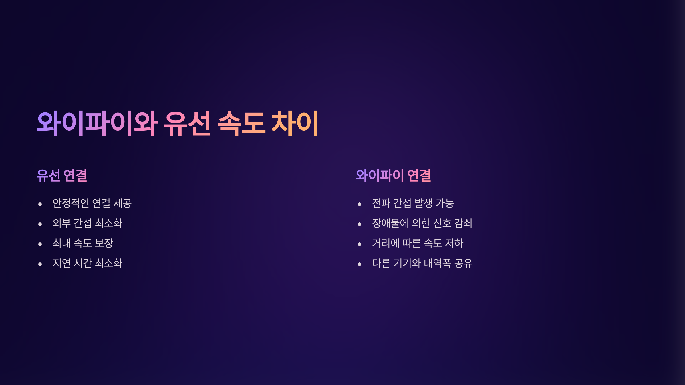 와이파이와 유선 속도 차이 와이파이(Wi-Fi)는 무선으로 연결되는 만큼 편리하지만, 유선보다 속도나 안정성에서 불리할 수 있어요. 전파 간섭, 거리, 벽 구조 등 외부 요인의 영향을 많이 받거든요.