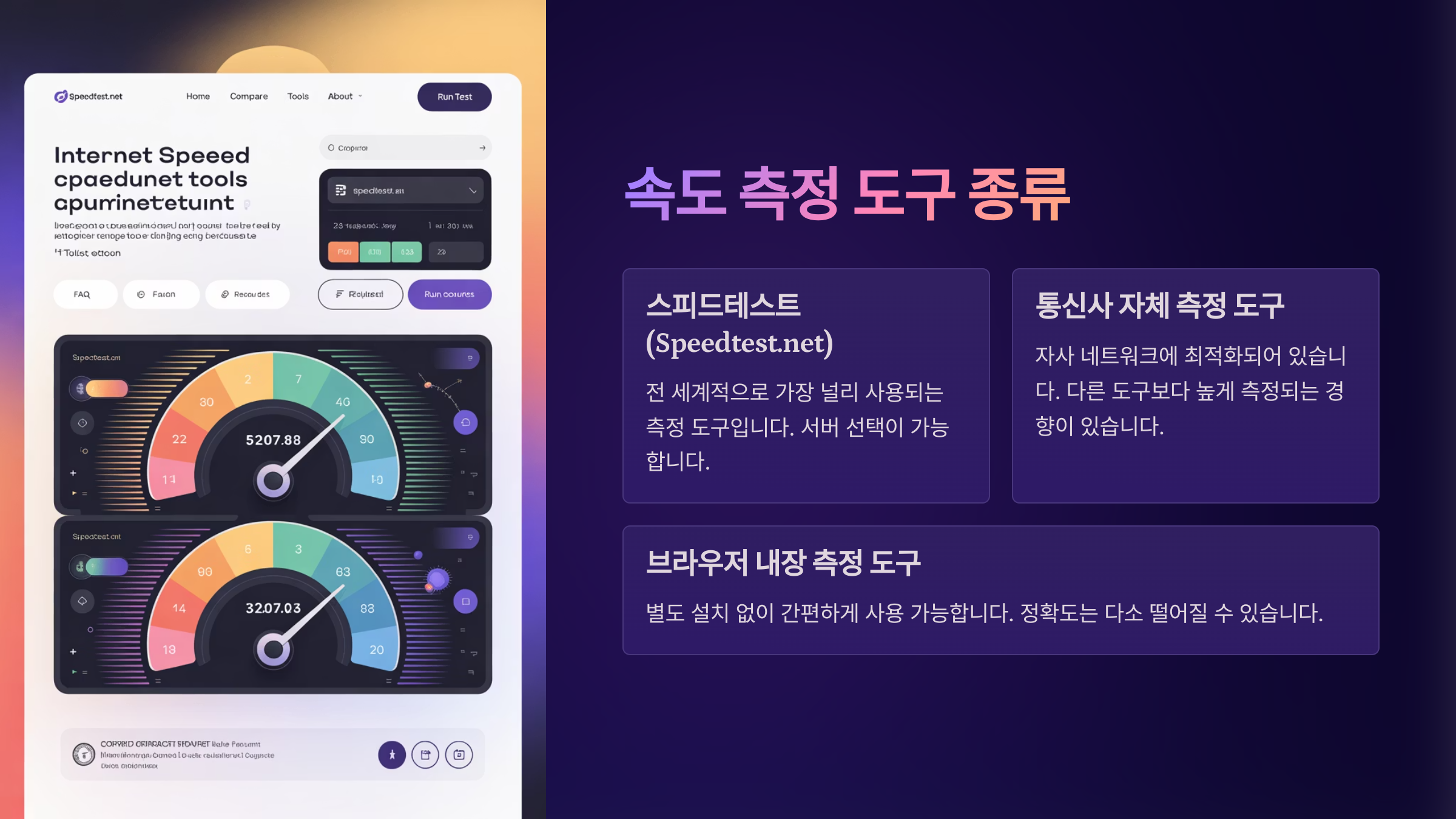 속도 측정 도구 종류 인터넷 속도를 측정할 수 있는 도구는 매우 다양해요. 그중에서도 가장 널리 사용되는 건 '스피드테스트(Speedtest.net)'에요. 웹 브라우저에서 바로 실행할 수 있어서 접근성이 좋답니다.