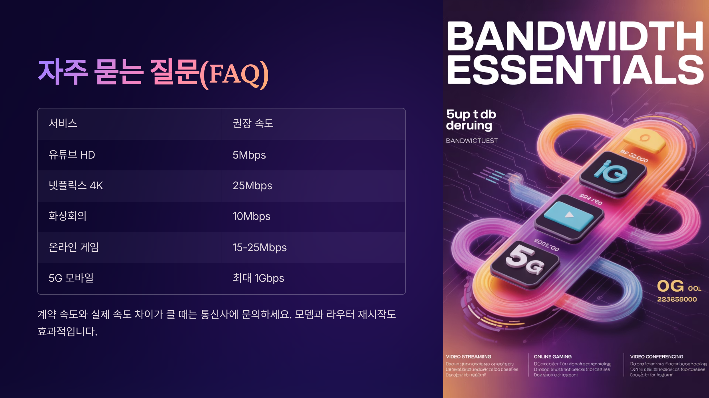 Q1. 인터넷 속도는 몇 Mbps가 적당한가요?A1. 일반 가정에서는 100~500Mbps면 충분하지만, 4K 스트리밍이나 고사양 온라인 게임은 1Gbps 이상이 더 안정적이에요.