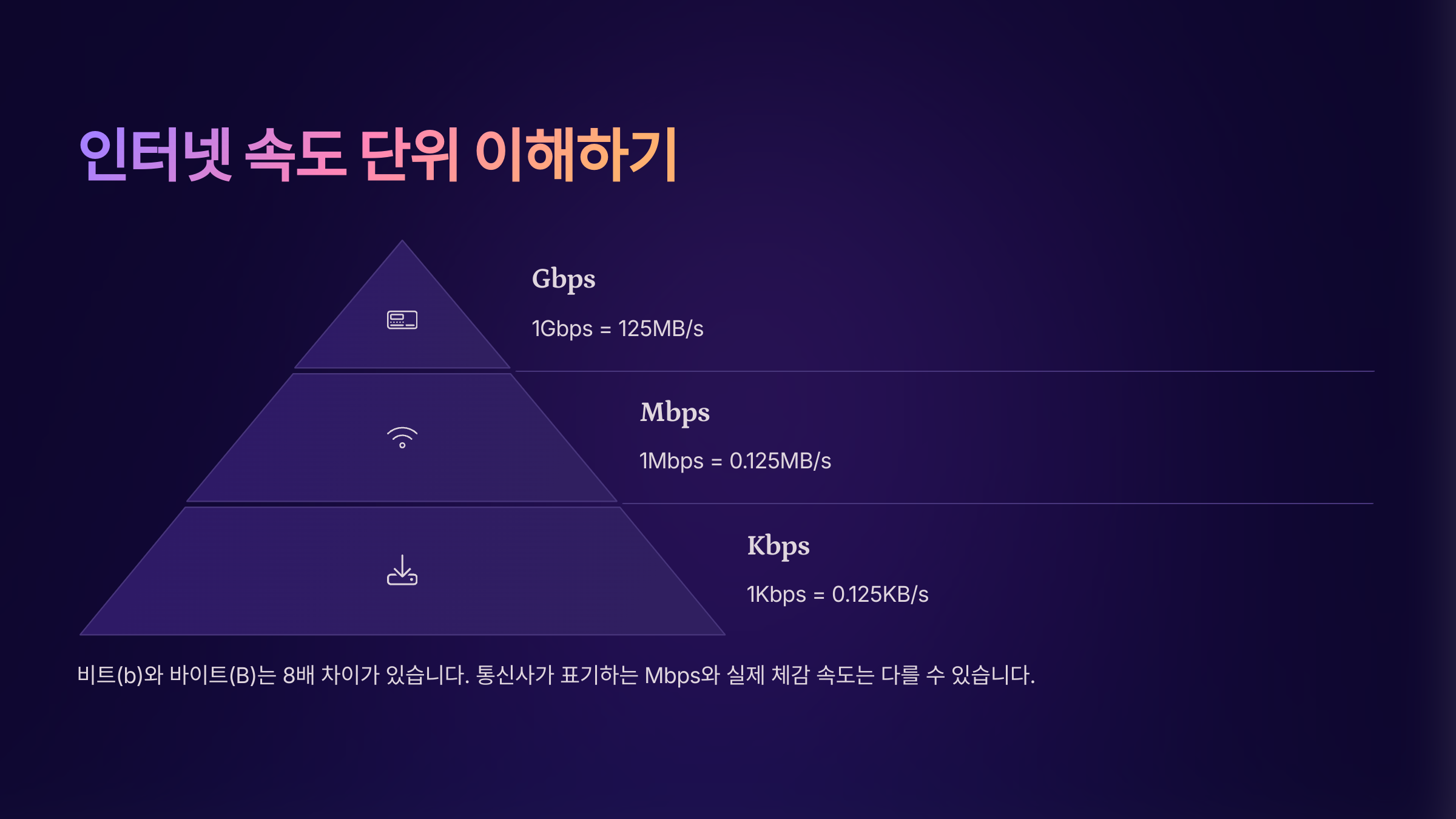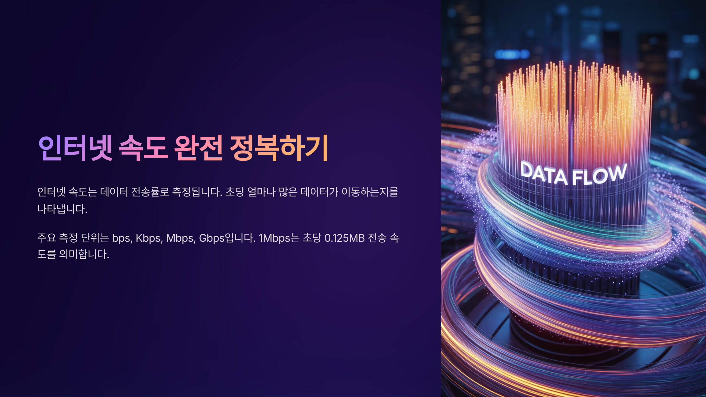 인터넷 속도는 데이터를 얼마나 빠르게 전송하거나 받을 수 있는지를 나타내는 수치예요. 보통 Mbps(Megabits per second)라는 단위를 사용하죠. 이 수치가 높을수록 더 빠른 속도를 의미해요.다운로드 속도는 내가 콘텐츠를 받을 때의 속도, 업로드 속도는 내가 데이터를 보낼 때의 속도를 말해요. 예를 들어, 유튜브에서 영상을 볼 때는 다운로드 속도가 중요하고, 줌으로 영상통화를 할 때는 업로드 속도도 매우 중요하답니다.