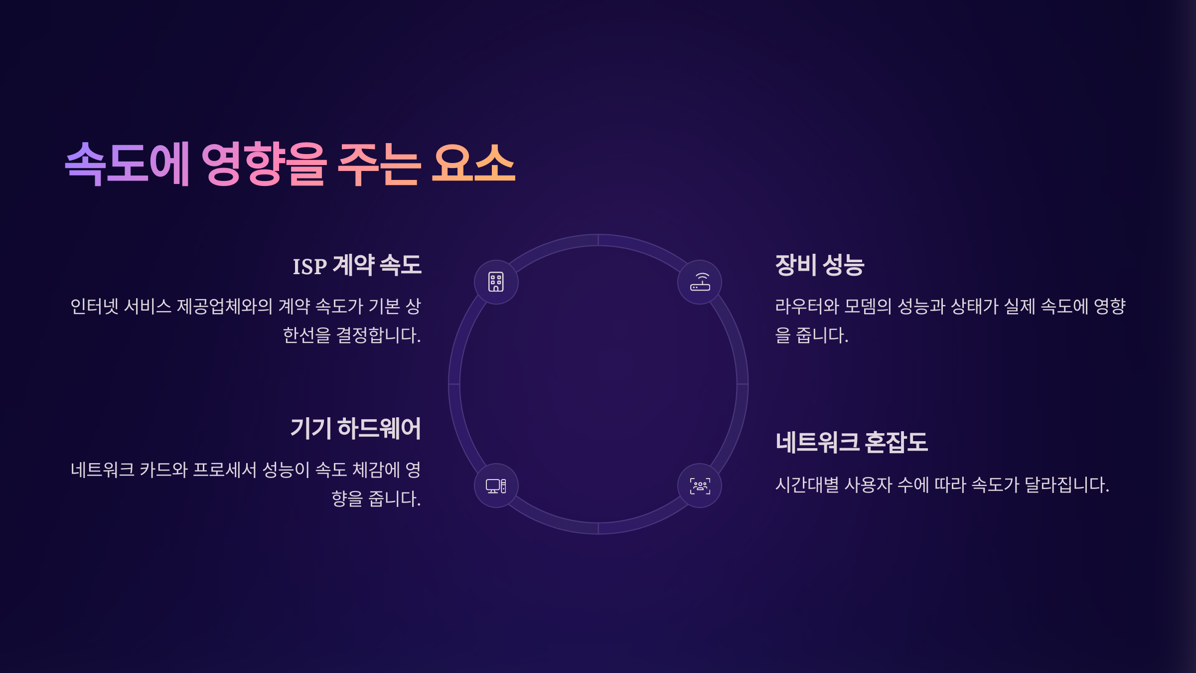 인터넷 속도는 단순히 회선 품질만으로 결정되지 않아요. 사용 중인 장비 상태도 큰 영향을 끼친답니다. 오래된 공유기나 케이블은 제 속도를 못 낼 수 있어요.또한 동시에 인터넷을 사용하는 사람이 많을수록 속도가 느려질 수 있어요. 가족들이 넷플릭스를 보고 있고, 누군가는 게임을 하고 있다면 대역폭이 나눠져서 속도 저하가 생길 수 있죠.