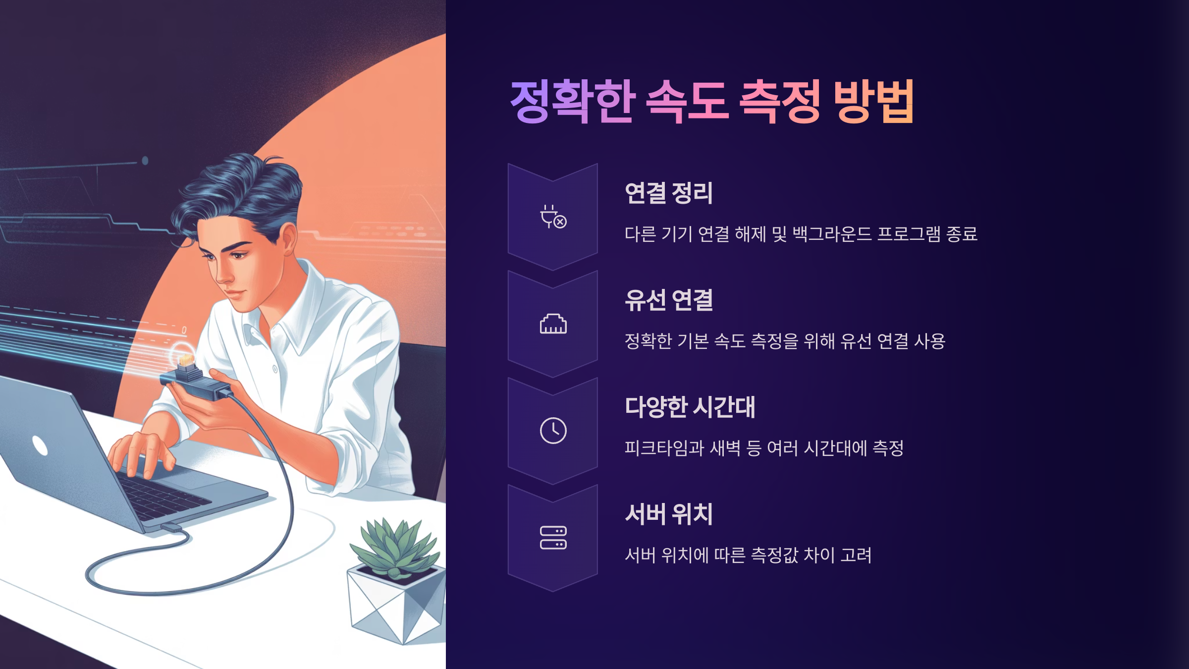 세 번째로는 테스트 시간대도 중요해요. 새벽이나 낮보다 저녁 시간대는 사용자들이 많이 몰려 속도가 느려지는 경우가 많아요. 그래서 하루 중 여러 시간대에 테스트해보고 평균값을 보는 게 좋아요.