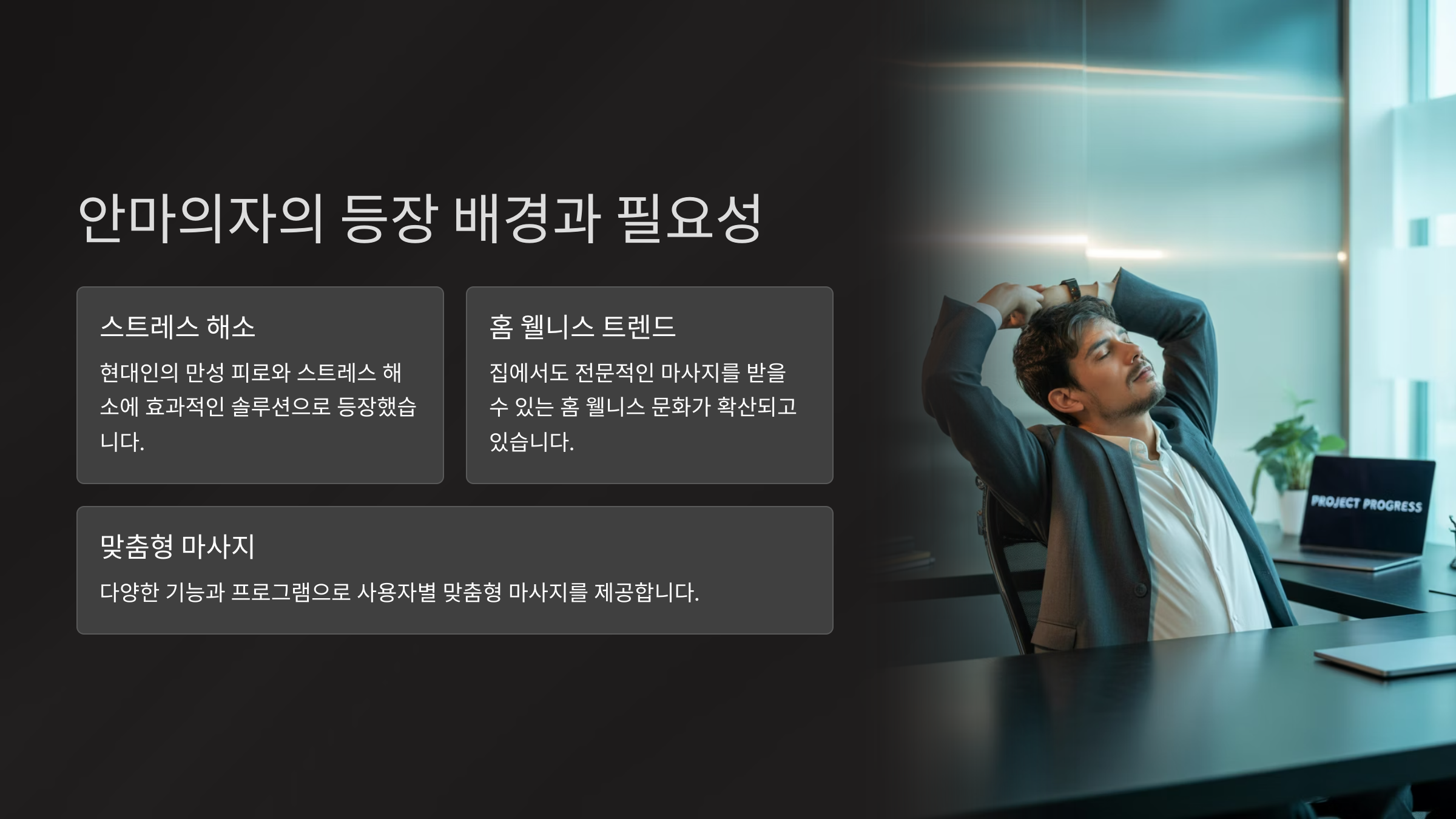 특히, 스마트워크와 재택근무가 늘어나면서 장시간 앉아 있는 사람들이 많아졌는데요, 이로 인해 목과 어깨, 허리 통증을 호소하는 사람들이 급증했어요. 안마의자는 이런 통증을 줄이고 일상에서 회복할 수 있는 도구로 주목받고 있어요.