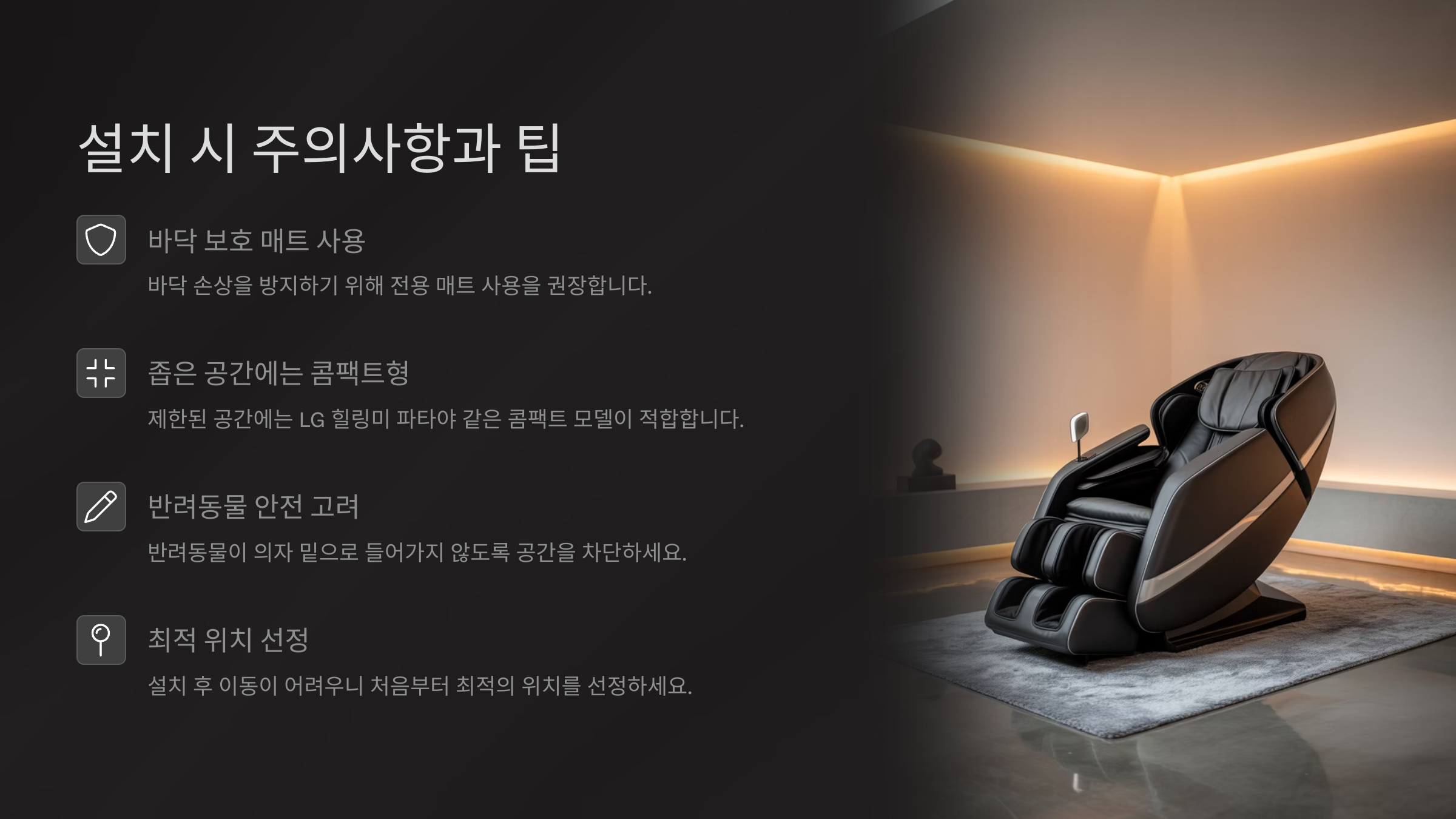 설치 공간은 바닥이 평평하고 습기가 적은 곳이 좋아요. 특히 리클라이닝 기능은 기계의 무게 중심에 영향을 주기 때문에, 바닥이 고르지 않으면 오작동이나 소음이 발생할 수 있답니다.