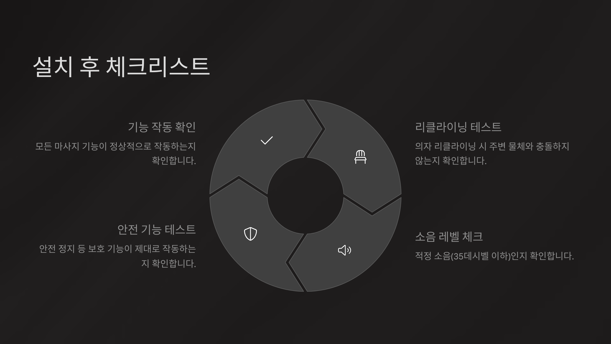 네 번째는 '안정성 테스트'예요. 실제 사용자가 앉았을 때 흔들림이 없는지, 기계가 중심을 잃지 않고 부드럽게 작동하는지를 확인해 주세요. 특히 리클라이닝 시에는 제품 하단이 뜨지 않는지도 중요해요.