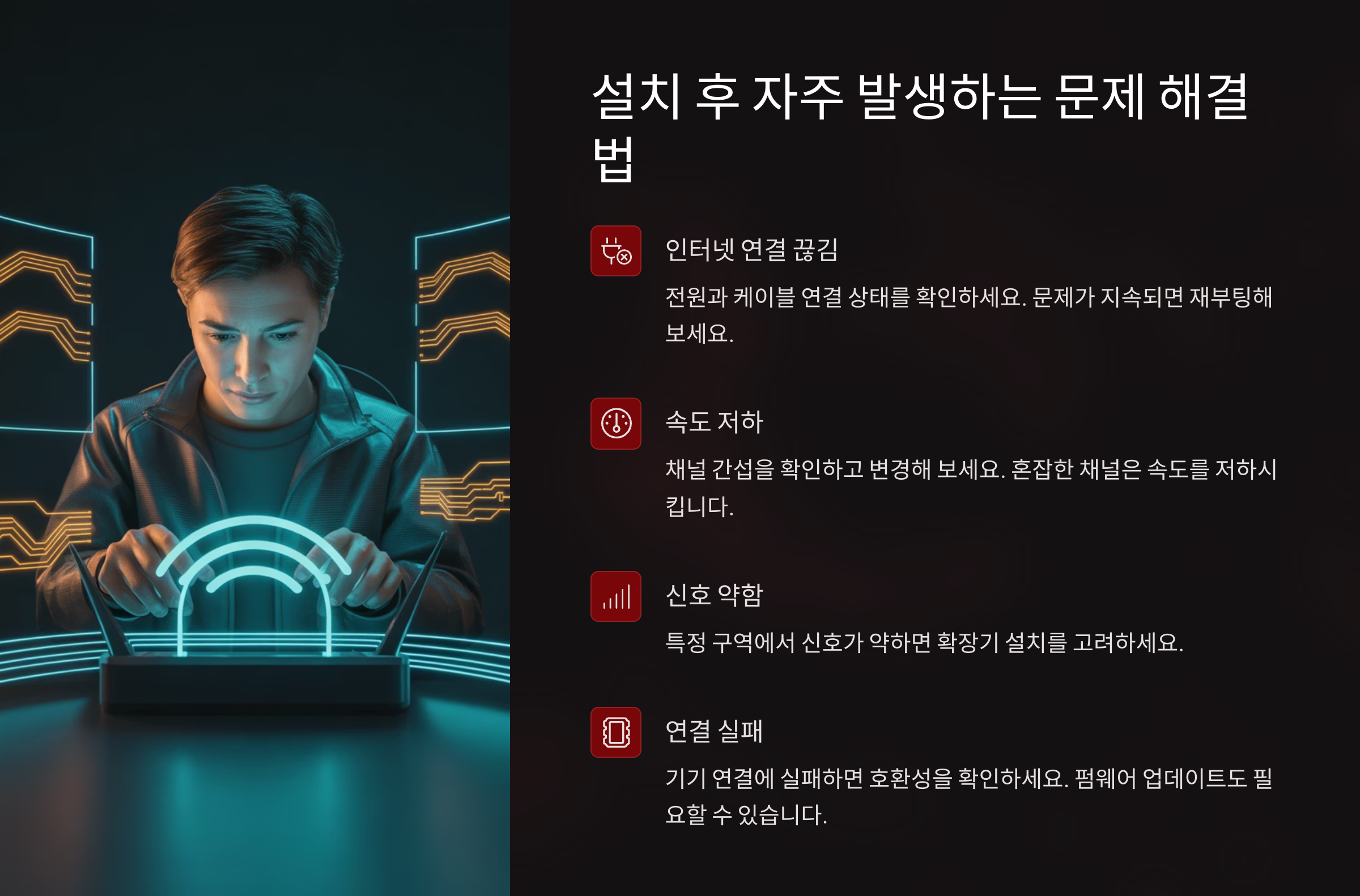설치 후 자주 발생하는 문제 해결법 공유기를 잘 설치했는데도 갑자기 인터넷이 끊기거나, 특정 방에서는 와이파이가 약하게 잡히는 경우가 있어요. 이런 문제는 대부분 간단한 방법으로 해결할 수 있으니 걱정하지 마세요. 😊
