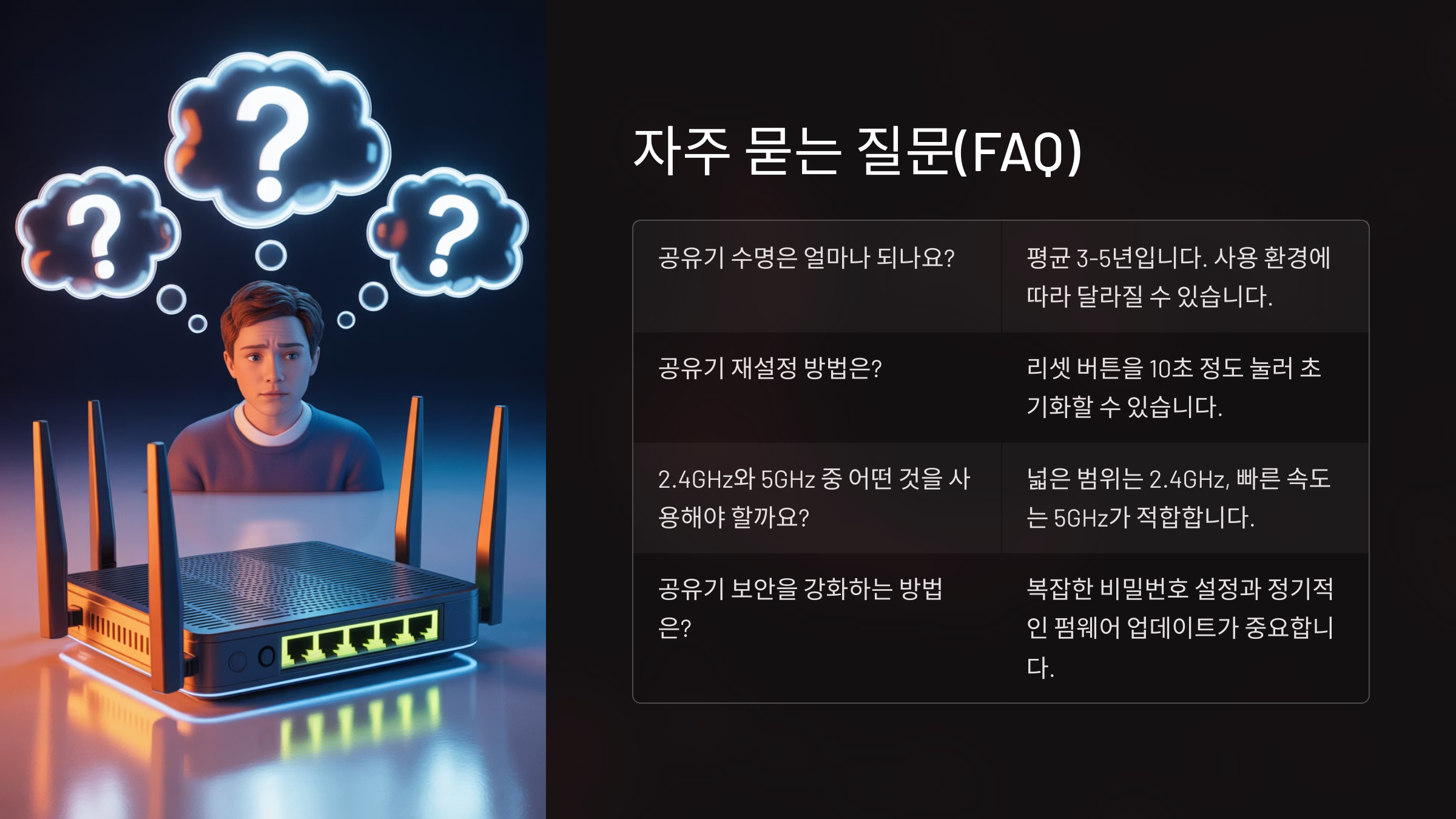 위치 좋은 이유 주의사항 거실 중앙 집 전체에 균형 있는 전파 전달 전자기기와 거리 유지 책장 위 높은 위치에서 장애물 최소화 벽면 밀착 금지 복도 구석 X 신호 왜곡, 도달 거리 단축 TV 뒷면 X 전자파 간섭 발생 공유기를 잘 설치하는 것만으로도 집 안 어디서나 스트레스 없이 유튜브도 보고, 게임도 하고, 회의도 끊김 없이 진행할 수 있어요. 이제 남은 건, 자주 묻는 질문들을 정리한 FAQ예요. 📘
