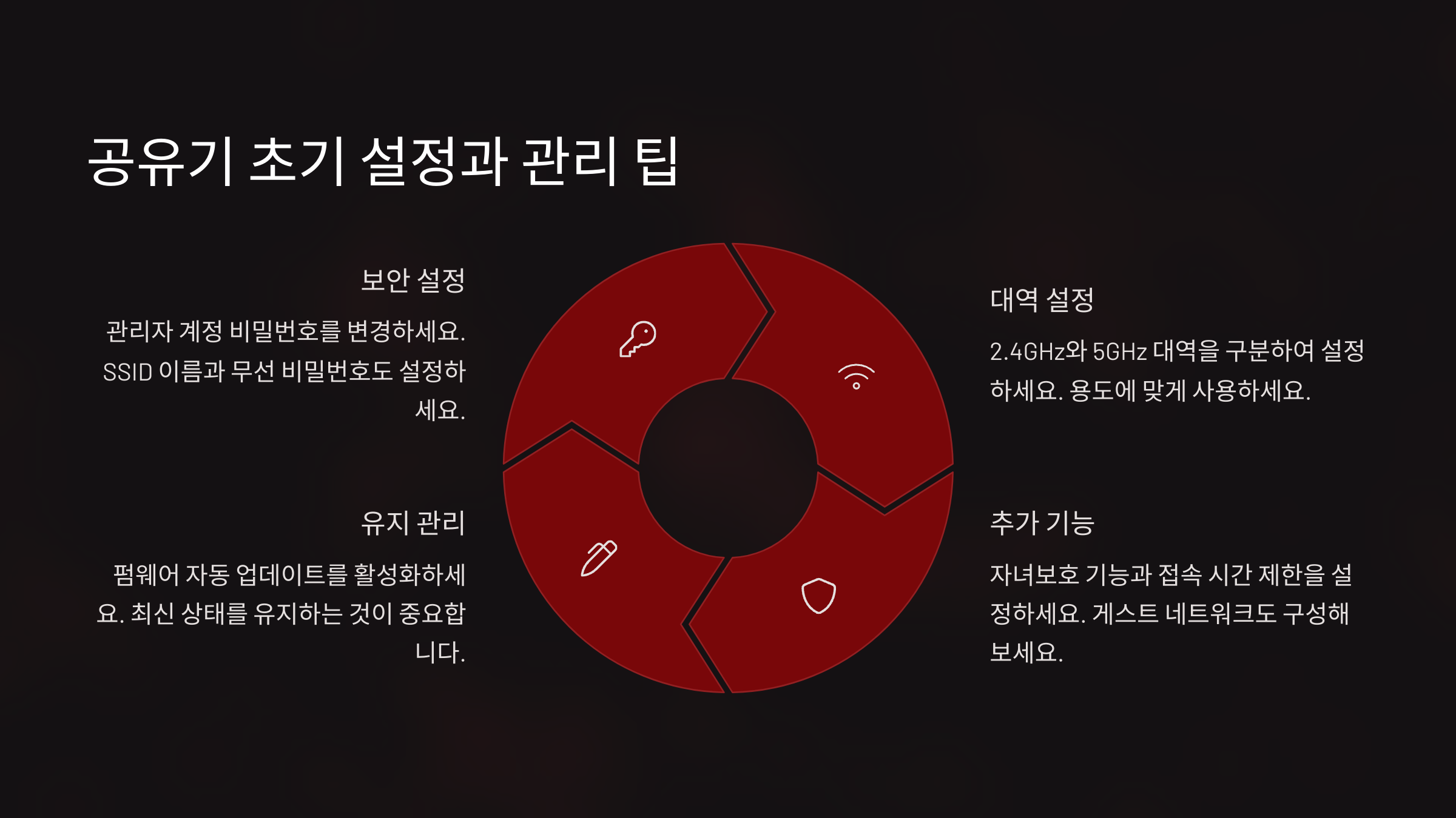 항목 설명 권장 여부 SSID 변경 기본 이름에서 나만의 이름으로 변경 ✅ 와이파이 비밀번호 설정 강력한 조합 사용 (문자+숫자+기호) ✅ 펌웨어 업데이트 보안과 성능 향상을 위해 필수 ✅ 게스트 네트워크 방문객용 별도 와이파이 ✅ 공유기 설정을 마친 후에는 관리자 페이지의 로그인 정보도 꼭 변경해 주세요. 아이디가 'admin', 비밀번호도 'admin'이면 누구든 접속해서 설정을 바꿀 수 있어요. 다른 사람이 쉽게 추측할 수 없는 조합으로 바꾸는 게 안전해요. 🛡