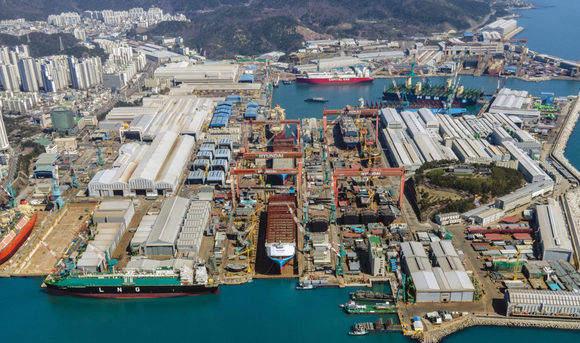 울산 본사는 약 300만㎡ 규모의 부지에 자리잡고 있고, 하루 2~3척 이상의 대형 선박을 동시 건조할 수 있는 10만 톤급 도크와 초대형 Goliath 크레인이 설치돼 있어요. 전 세계 선박의 약 15%가 여기서 만들어졌다고 할 정도예요.