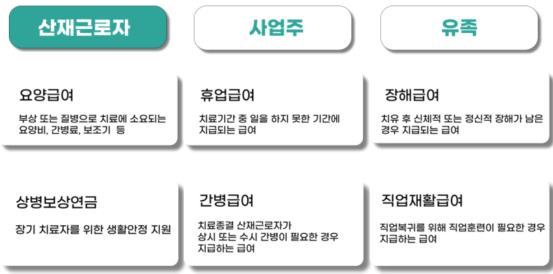 - 요양급여: 근로자가 산재로 인해 부상을 입거나 질병에 걸렸을 때, 필요한 치료를 받을 수 있도록 의료비를 지원하는 항목입니다.