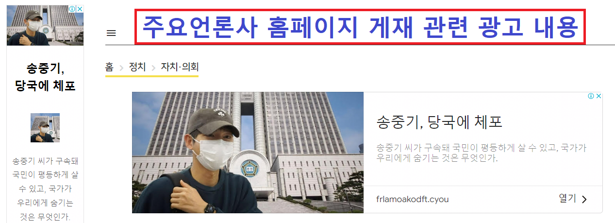 주요 언론사 홈페이지 주요 광고란을 아래와 같이 차지하고 있어 잘못하면 언론사에서 취재하여 올린 기사로 착각할 수 있다는 점에서 주의가 필요합니다.