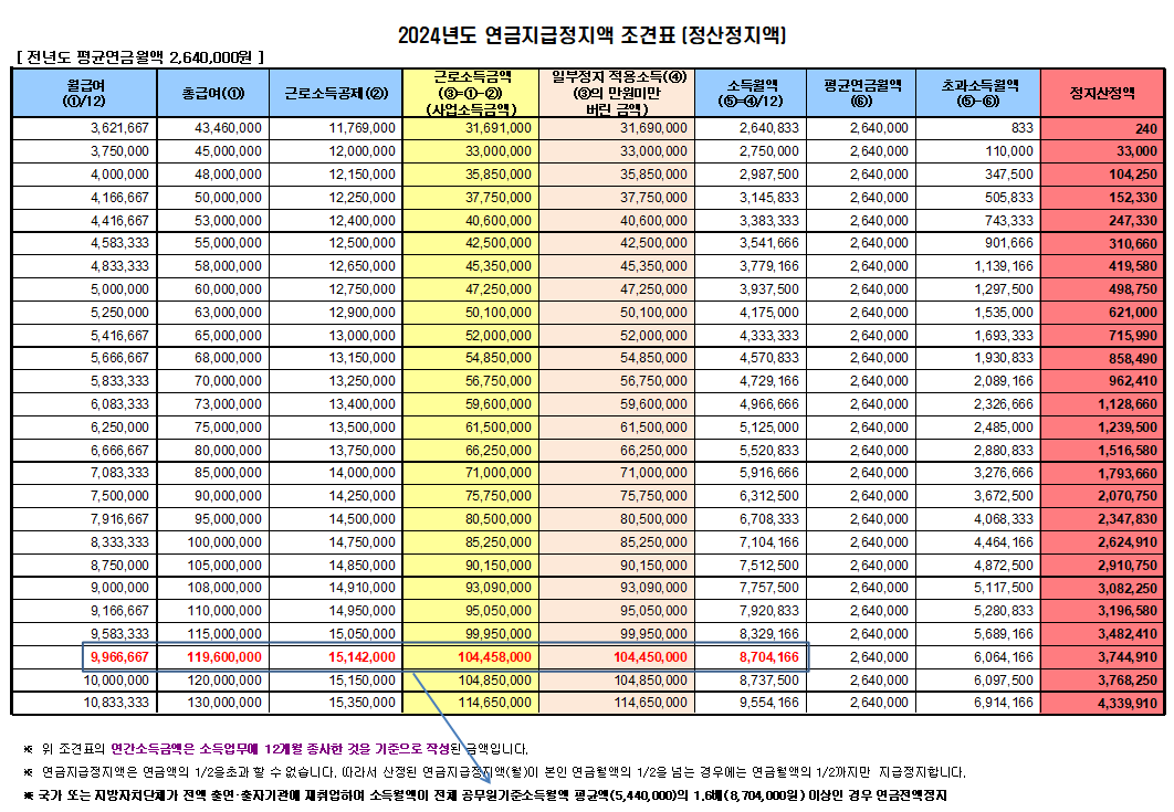 2024년도 기준 금액은 근로소득 공제금액 제외, 필요경비 제외한 금액이 월평균 264만원 초과시 일부정지 대상입니다. 일부정지는 기준 금액을 초과하는 경우 초과 소득금액에 따라 매월 지급되는 연금이 아래표의 오른쪽 빨간색 금액에 해당되는 금액을 빼고 지급되며, 최대 연금월액의 1/2까지만 정지됩니다.